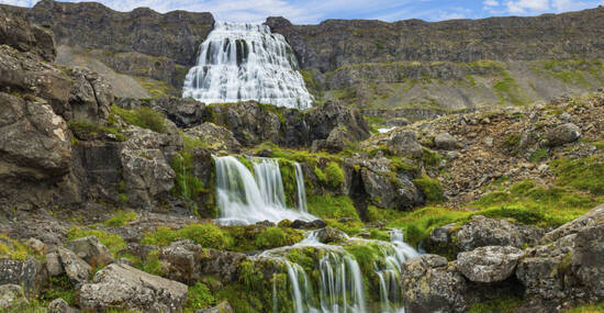 Wir erkunden Islands abgelegene Westfjorde, die älteste und unberührteste Region der Insel. Mit einem Zodiac-Boot erreichen wir Dynjandi – den „Donnernden“ Wasserfall –, eine 100 Meter hohe Kaskade, die wie eine riesige Hochzeitstorte über Basaltstufen stürzt.