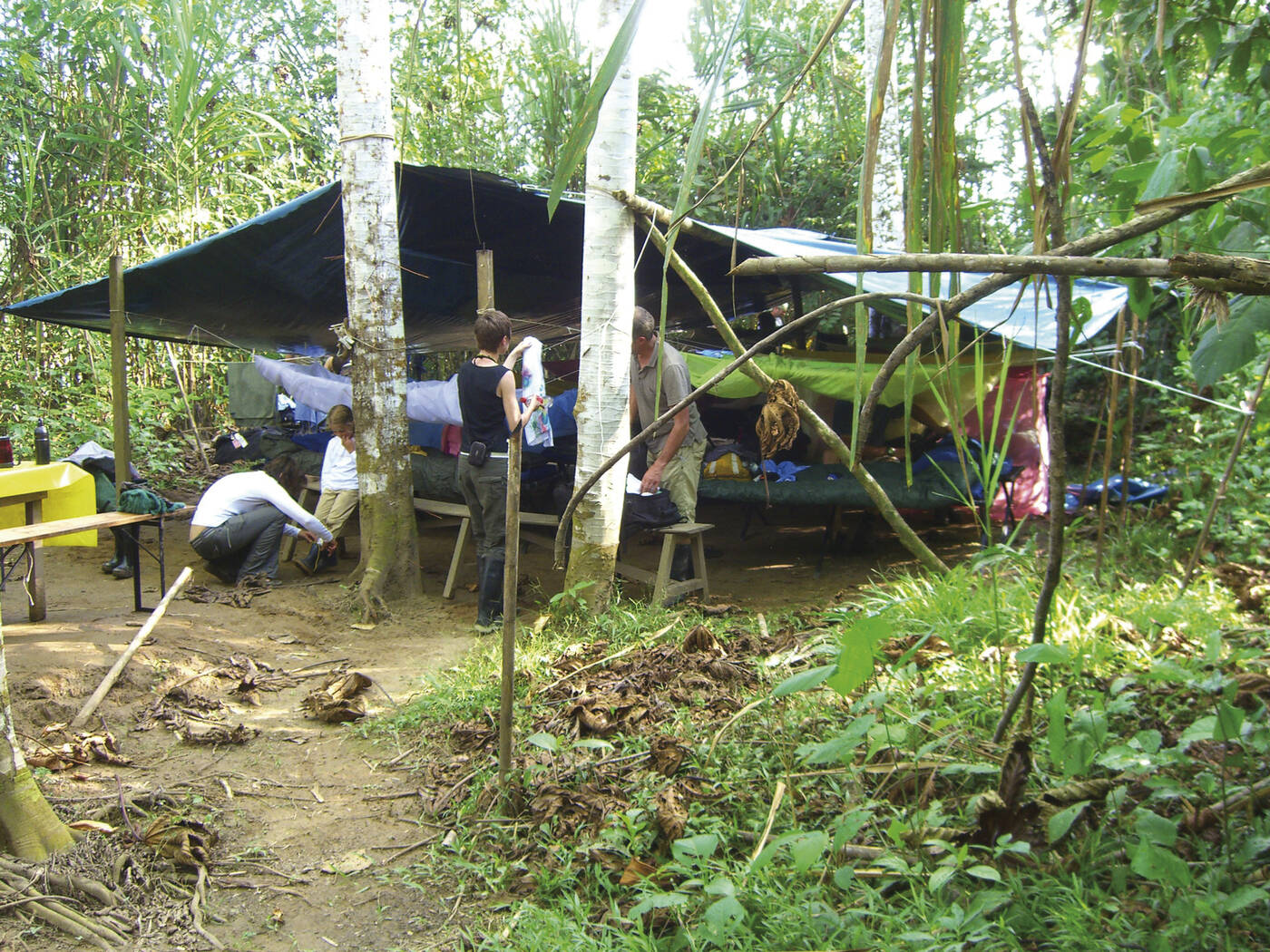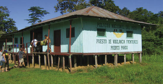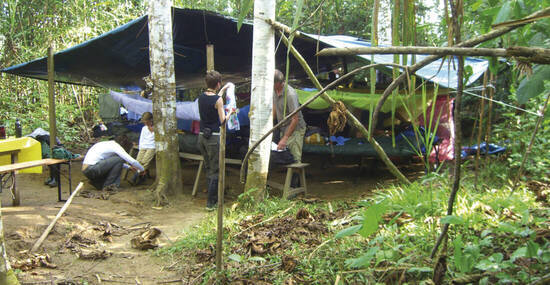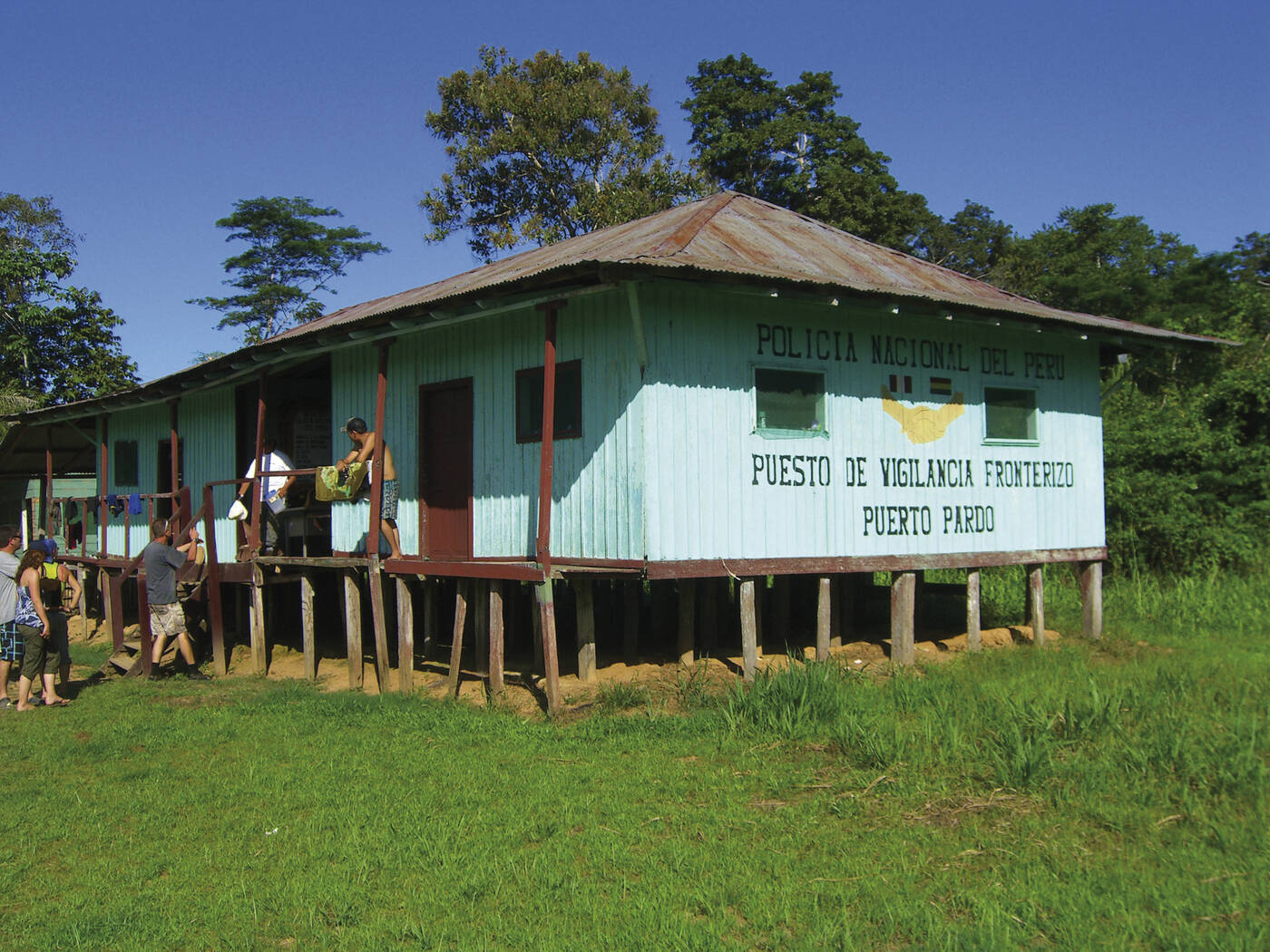 Wir fahren weiter tief in den Dschungel in Richtung Bolivien, bis der Fahrer des Kleinbusses im Dschungel beim besten Willen nicht mehr weiterkommt. Nun müssen wir zwischen 200m und 2.000m zu Fuß weiterlaufen, bis wir einen kleinen, völlig abgelegenen bolivianischen Polizei- und Militärposten erreichen. Argwöhnisch werden wir inspiziert, da im Schnitt nur zweimal im Monat hier jemand die Grenze überquert. An einer weiteren Grenzsperre werden unsere Pässe abgestempelt. Herzlich Willkommen in Bolivien! Wir fahren nun weiter über sehr schlechte Sand- und Schotterpisten, bis wir ein Versorgungsdorf am Rio Madre de Dios erreichen. Unser Bootsteam erwartet uns hier bereits mit unserem Gepäck und den aufgestellten Feldbetten.