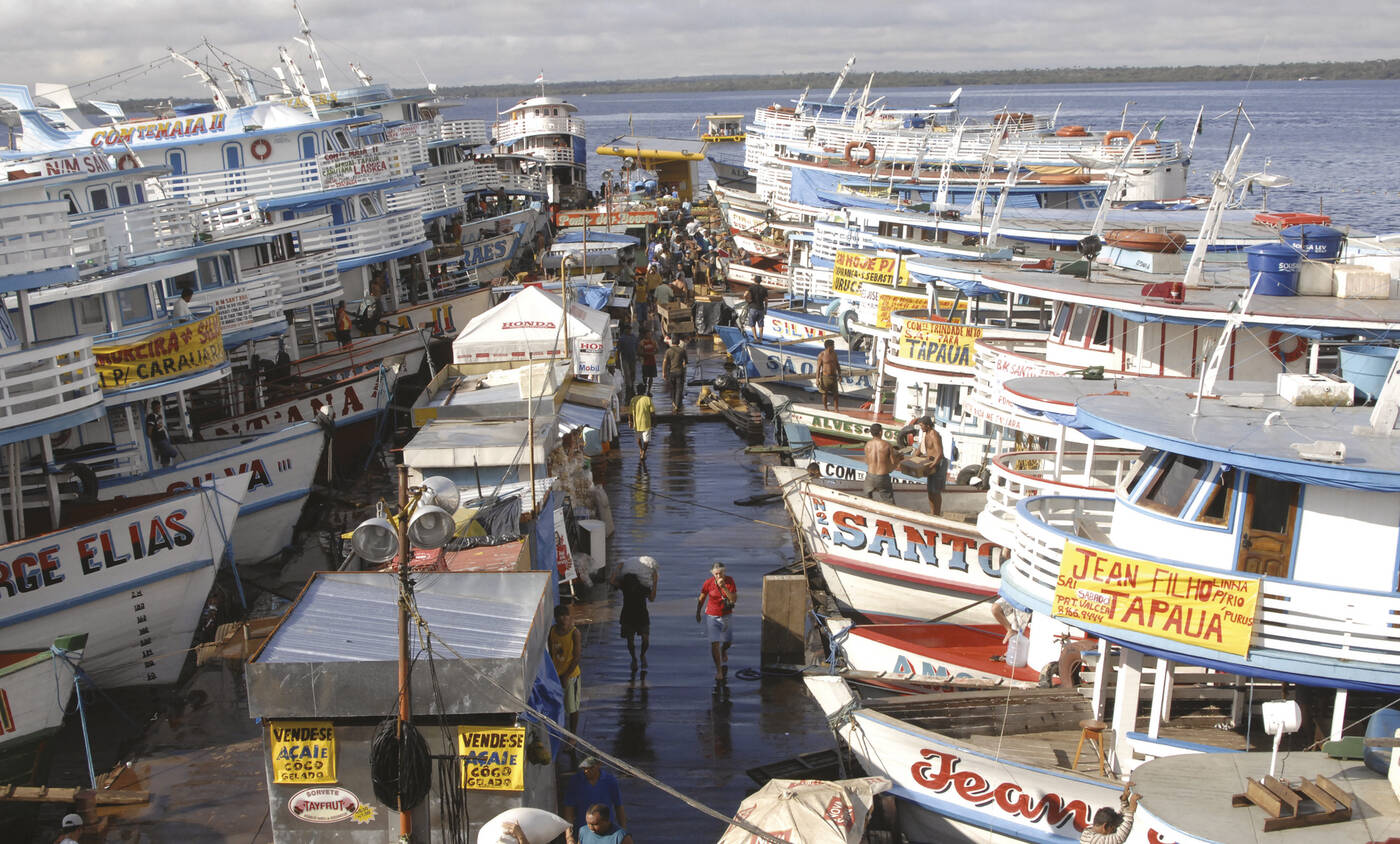 Vom Hafen in Manaus aus schiffen wir uns an Bord eines Frachtschiffes mit dem Ziel Santarém ein. Nachdem wir unsere Hängematten auf dem oberen Hängemattendeck aufgehangen haben, beobachten wir das Laden der Fracht durch viele fleißige Hände, die innerhalb weniger Stunden viele hundert Tonnen an verschiedenen Gütern geschickt im Schiff verstauen.