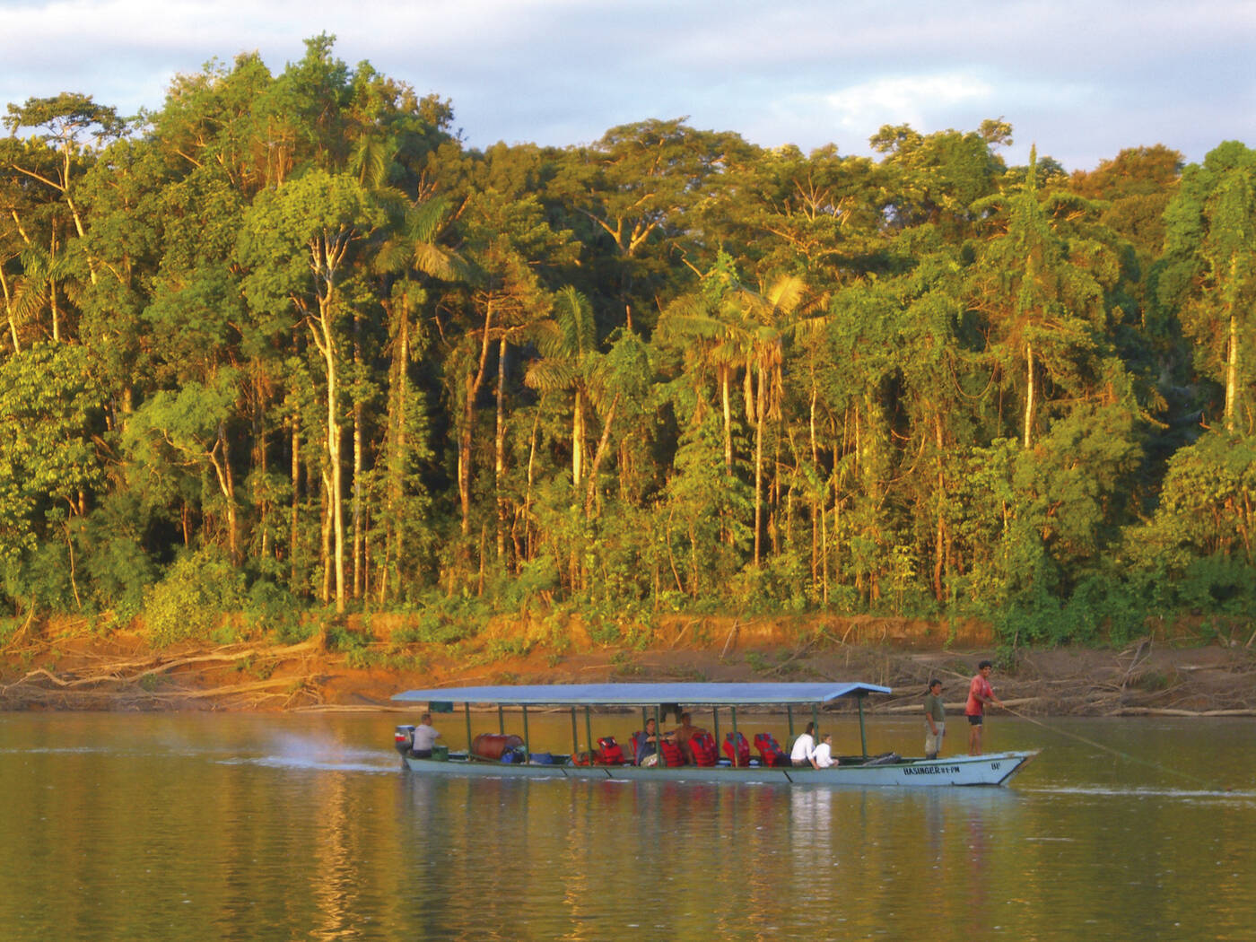 Früh am Morgen geht es mit unsrem Expeditionsboot am Rand der Naturreservate Manupiri und Humayta auf dem Fluss Madre de Dios weiter.