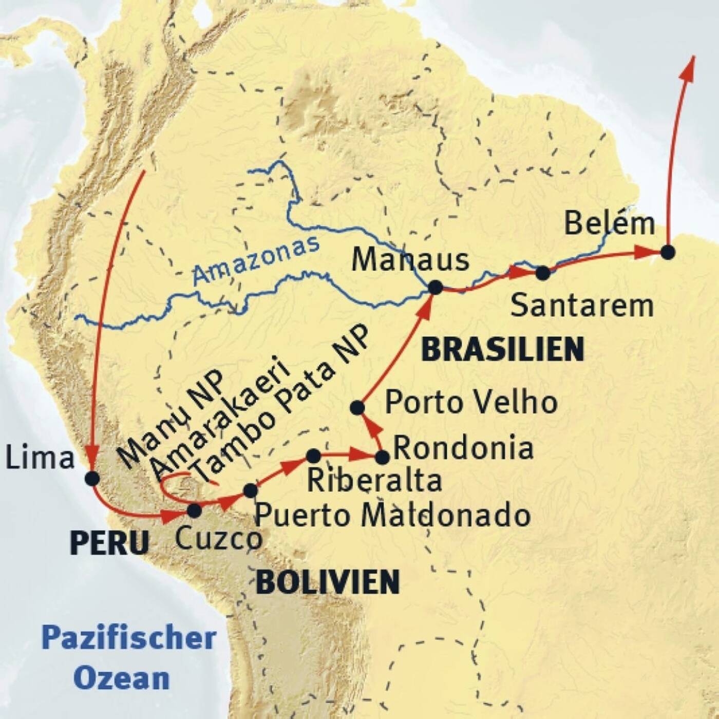 PERU: Lima - Cusco - Manu-Nationalpark - Boca Manu - Tambopata-Nationalpark - Puerto Maldonado - BOLIVIEN: Cobija - Riberalta - BRASILIEN: Rondonia - Porto Velho - Manaus - Santarem - Belém