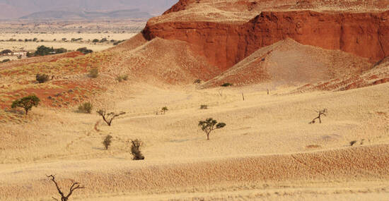 Frühes Frühstück, es folgt der Transfer zur Hauptabreisestelle. Mit dem Gästebus - und wahrscheinlich auch anderen Gästen - geht es in die Namib-Wüste (ca. 4 Std.). Unterwegs haben wir Zeit, uns mit guter Lektüre und/oder namibischen Reisehandbüchern zu beschäftigen. Unsere Unterkunft liegt am Fuße einer Versteinerten Düne. Nachmittags optional eine Naturrundfahrt, die untergehende Sonne taucht die Umgebung in ein besonderes Licht, in der Ferne grüne Bänder - die Vegetation an den Flussläufen - und Lila-Blaue Berge, eine ganz besondere Landschaftskulisse. Oder wir wandern auf dem Gelände der Lodge. Oft kann man die hübschen Oryx-Antilopen am Wasserloch beobachten. Ein Ort, der darauf wartet, entdeckt und erkundet zu werden, um die Füße hochzulegen und die Ruhe und Weite - so weit das Auge reicht - zu genießen.
