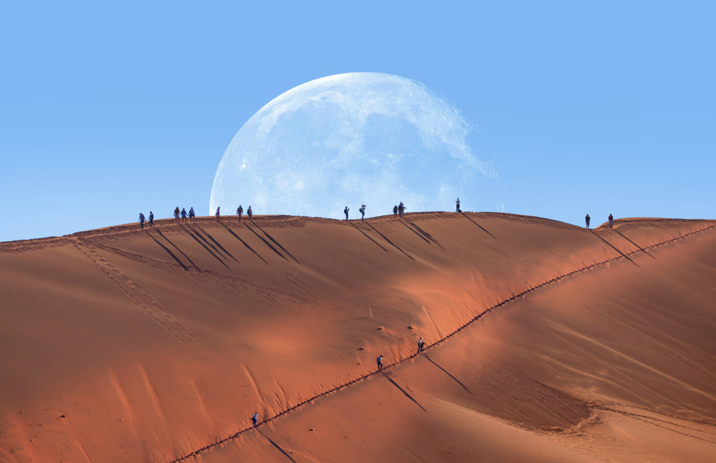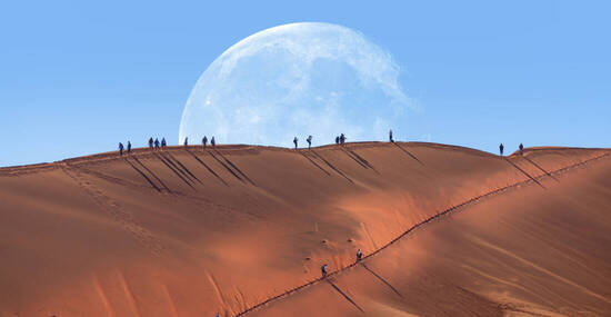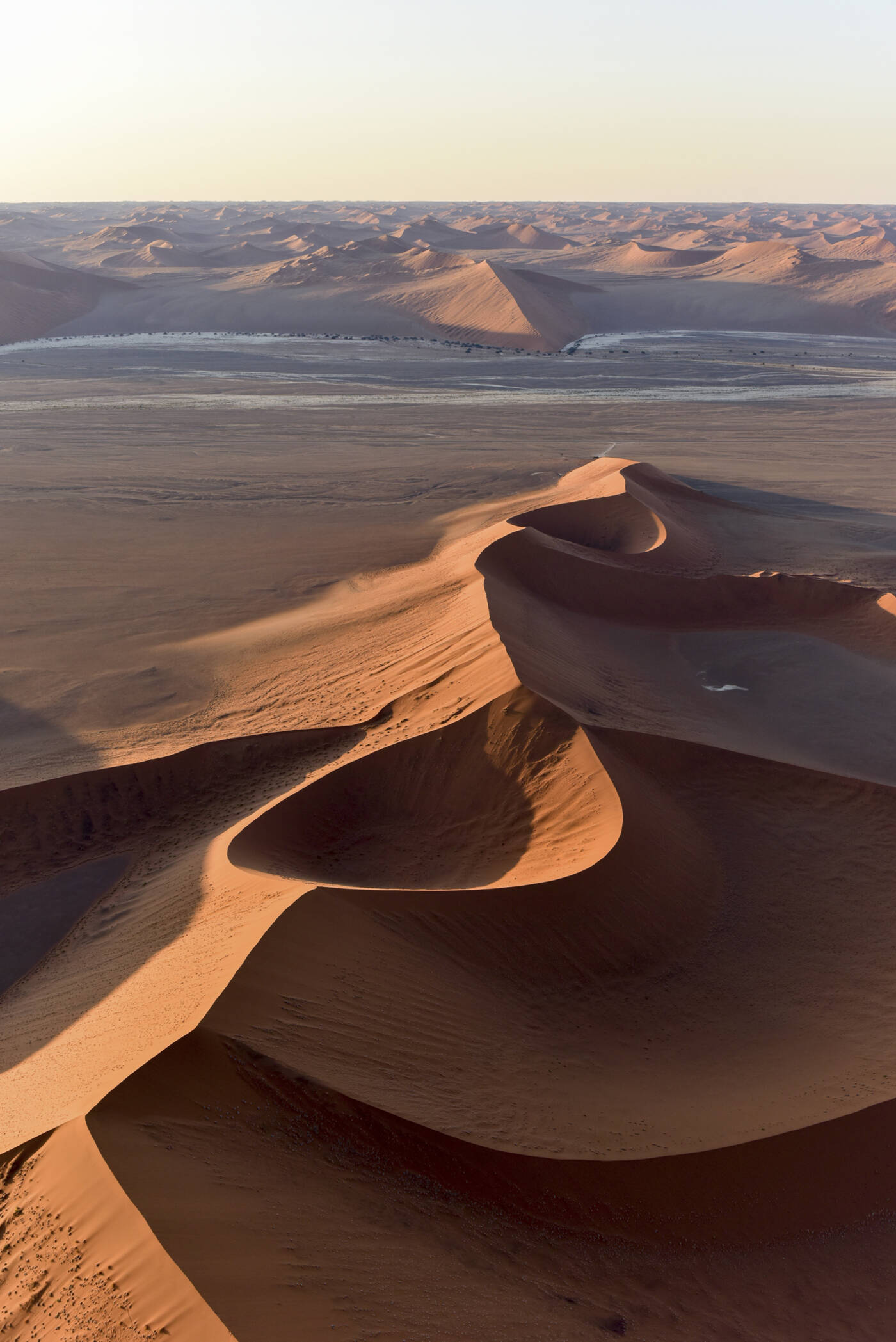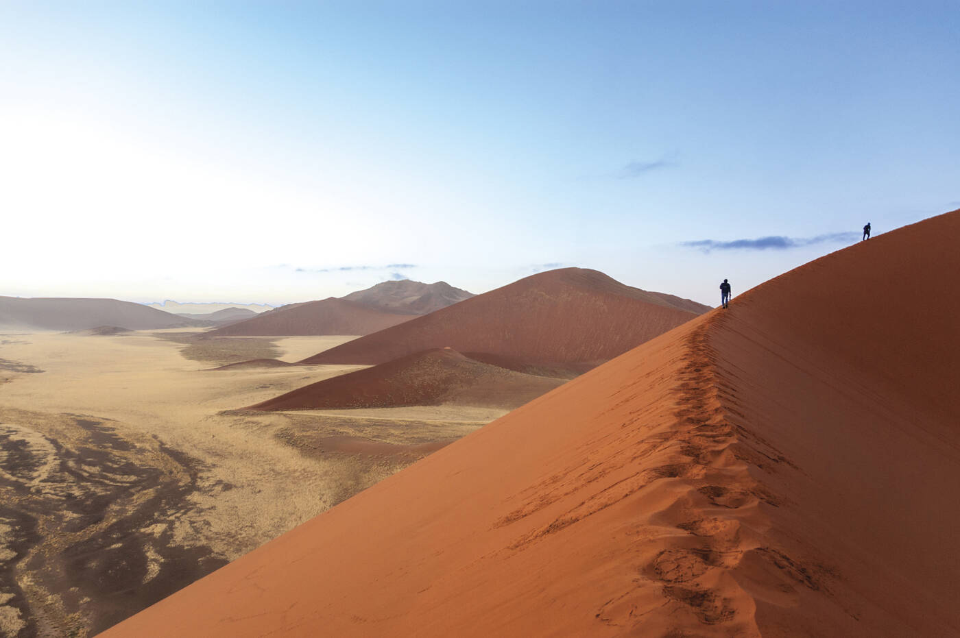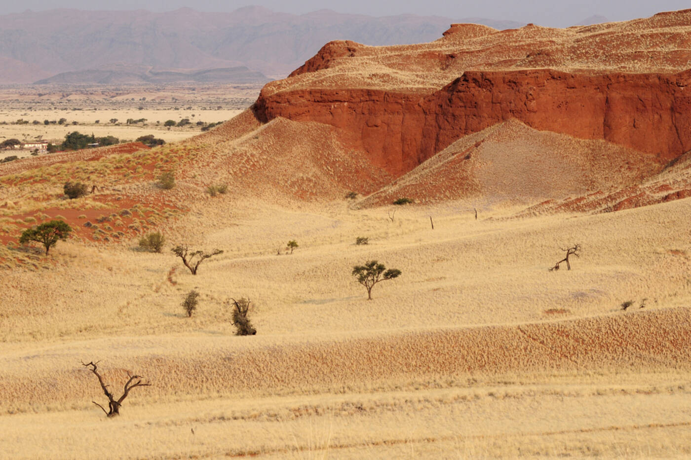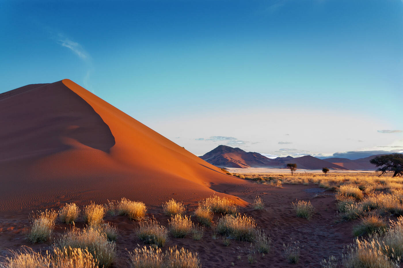 Fast nirgendwo im Lande kann man unverfälschte Natur besser genießen als in der Endlosigkeit der ältesten Wüste der Erde, der Namib, was "leerer Platz" in der Sprache des einheimischen Nama-Stammes bedeutet. Sonnenauf- und -untergänge sowie Schattenspiele und Winde erzeugen einen ständigen Farbwechsel und eine immer wechselnde Farbintensität. Die einmaligen rot-orangenen Dünen von Sossusvlei – hier finden wir einige der höchsten Dünen der Erde – sind bis zu 350 m hoch. An einem der beiden Tage ein Ausflug in das Sossusvlei und zum Sesriem-Canyon, eine durch Erosion tief in die Erdkruste erodierte Schlucht, durch welche der Tsauchab-Fluss in guten Regenjahren bis in die Namib-Wüste fließt und große Lehmsenken mit Wasser füllt. Wir können die Dünenkämme hinaufwandern und den Sesriem-Canyon erkunden (wenn nicht mit Wasser gefüllt).