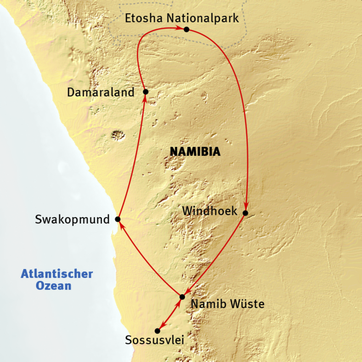 Namibia ist ein bezauberndes Reiseziel, das viel zu bieten hat. Bei dieser preisattraktiven Reise mit wenigen Unterkunftswechseln sind wir bestens organisiert unterwegs, verzichten aber auf eine geschlossene Gruppe mit festem Programm und einem ständigen Reiseleiter. Wir fahren nicht selbst, haben viel freie Zeit und entscheiden vor Ort über unsere Unternehmungen. Diese Reise eignet sich für alle Altersklassen, Familien mit Kindern, Afrika-Erstreisende, junge Leute, erfahrene Reisende und alle, die neue Menschen kennenlernen möchten. Langes Fahren und ständiges Kofferpacken vermeiden wir weitestgehend, da wir uns bewusst auf nur drei Standorte konzentrieren: die Namib-Wüste, den Atlantik und den Busch im Etosha-Nationalpark. In Swakopmund genießen wir das deutsch geprägte Leben mit beeindruckenden Bauwerken. Verlängerungen sind auf Anfrage möglich!