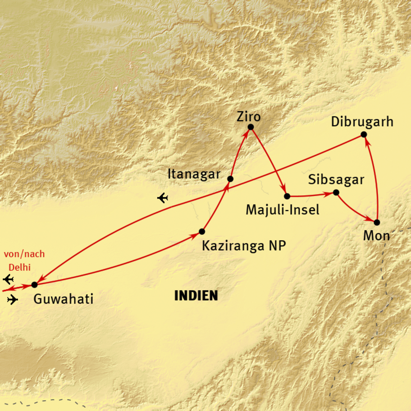 Die im Nordosten Indiens zwischen Bhutan, Tibet, Myanmar und Bangladesch gelegenen Provinzen sind nur durch einen schmalen Korridor mit dem Rest des Landes verbunden. Assam, Arunchal Pradesh und Nagaland gehören zu den am wenigsten besuchten und touristisch erschlossenen Teilen Indiens. Eine Reise hierher gewährt tiefe Einblicke in ein kaum bekanntes Indien: Wir besuchen zurückgezogen lebende Ethnien und entdecken die abwechslungsreichen Landschaften mit Dschungelwäldern und Teeplantagen, die erstklassigen Tee hervorbringen. Die Völker in diesen Gebieten leben kulturell unabhängig und sprechen eigene Sprachen. Zudem erkunden wir den Kaziranga-Nationalpark in Assam, ein UNESCO-Weltkulturerbe mit seltener Tierwelt. Diese Reise richtet sich an Neugierige, die das ursprüngliche, unberührte Indien erleben möchten und bereit sind, auf Luxus zu verzichten, um authentische Begegnungen zu genießen.