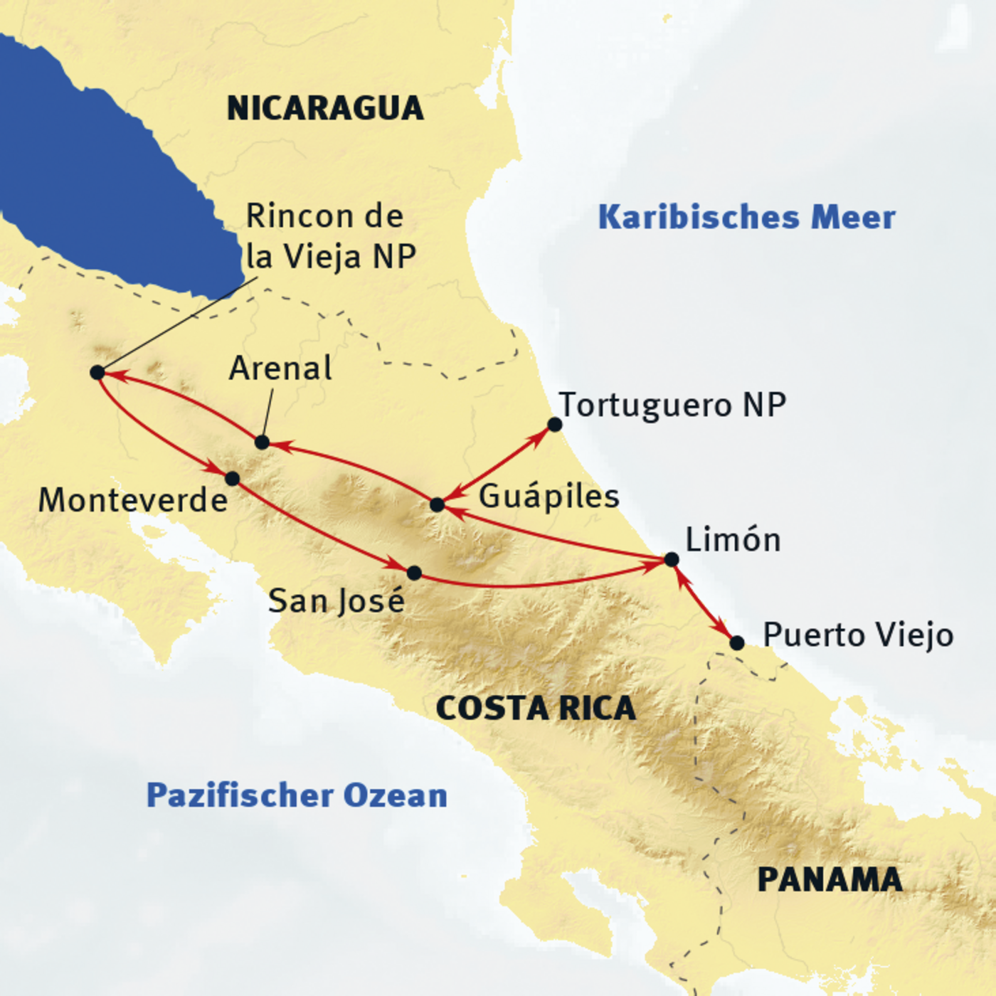 San José - Puerto Viejo - Tortuguero - Vulkan Arenal - Vulkan Rincón de la Vieja - Monteverde - San José