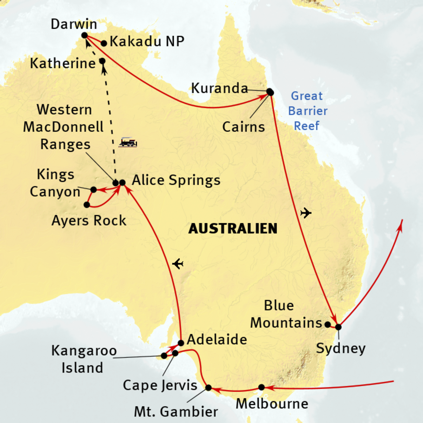 Melbourne - Great Ocean Road - Kangaroo Island - Adelaide - Alice Springs - King Canyon - Ayers Rock - Western MacDonnell Nationalpark - GHAN - Katherine - Kakadu Nationalpark - Cairns - Great Barrier Reef - Kuranda - Sydney - Blue Mountains