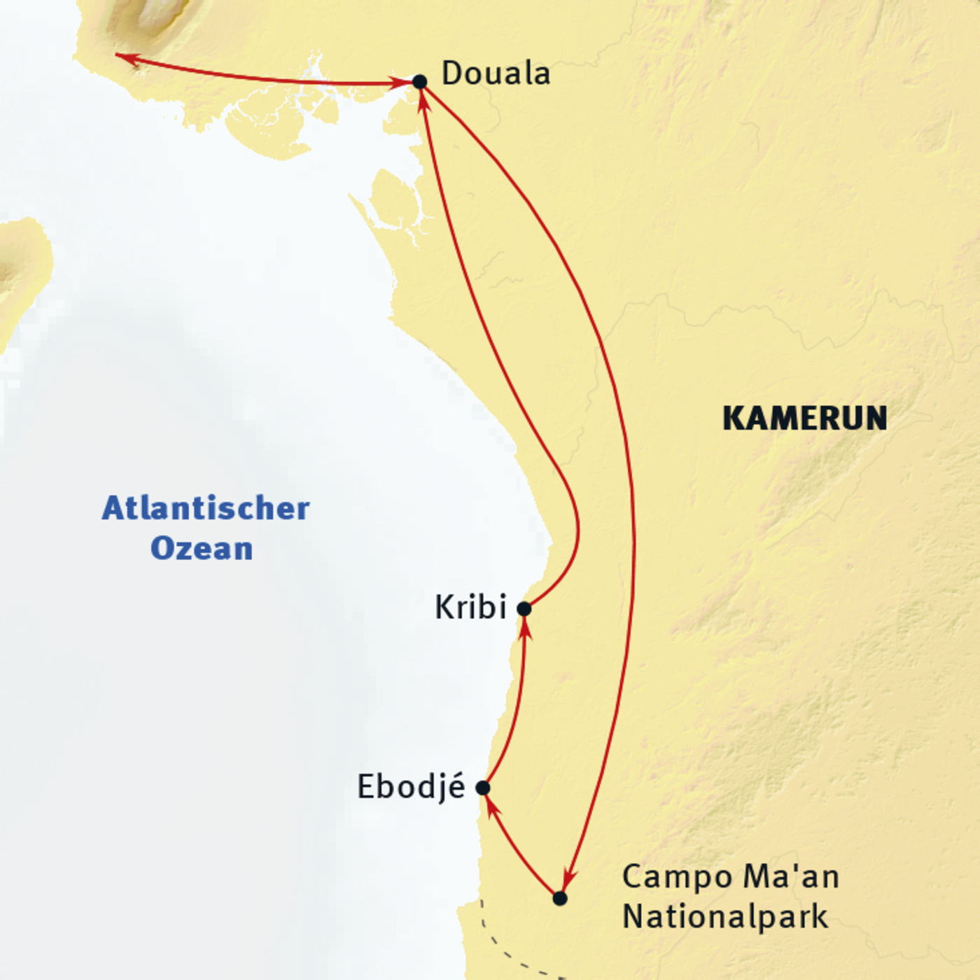 Am Morgen packen wir ein letztes Mal unsere Sachen für die Rückfahrt nach Douala. Vor dem Verlassen des Ortes Kribi wollen wir auf einer kleinen Besichtigung noch einen Blick auf Relikte aus deutscher Kolonialzeit werfen. Wir sehen einen Leuchtturm, eine Kirche sowie einen deutschen Friedhof. Sollten wir es zeitlich schaffen unternehmen wir noch eine kleine Stadtrundfahrt durch Douala. Die Stadt gilt als Wirtschafts- und Handelszentrum des Landes. Im großen Hafen liegen Containerschiffe aus aller Welt vor Anker, es herrscht geschäftiges Treiben um die Schiffe zu be- oder entladen. Bei einer Stadtrundfahrt bekommen wir einen guten Eindruck von der Stadt, die auch einst unter deutscher Kolonialherrschaft eine entscheidende Bedeutung hatte. Bis 1891 war die Hafenstadt Sitz der deutschen Kolonialverwaltung, bis die Stadt Buea diese Aufgabe übernahm. Wir genießen ein letztes gemeinsames Essen, bevor es zum internationalen Flughafen geht, von wo aus wir unseren Heimflug antreten.