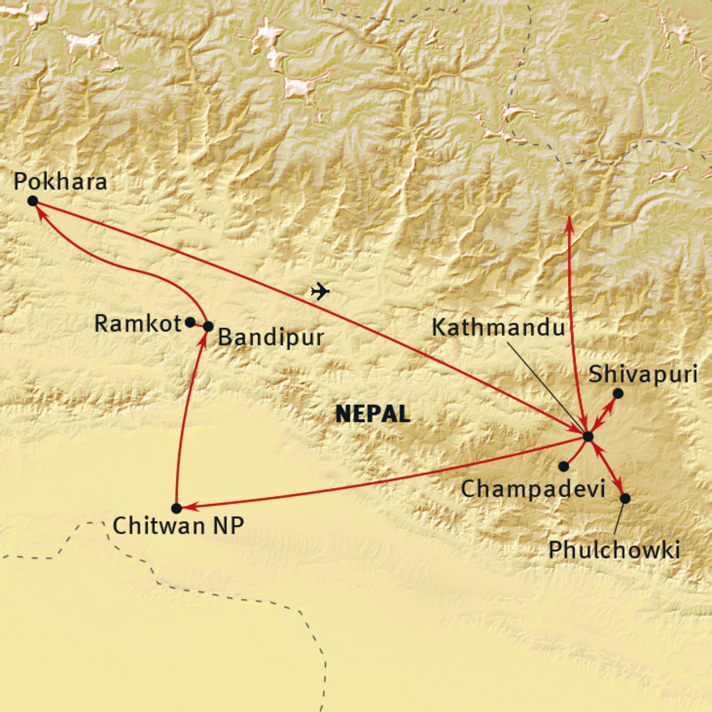 Kathmandu - Champadevi - Phulchowski - Shivapuri - Kathmandu - Chitwan Nationalpark - Bandipur - Ramkot - Bandipur - Pokhara - Kathmandu