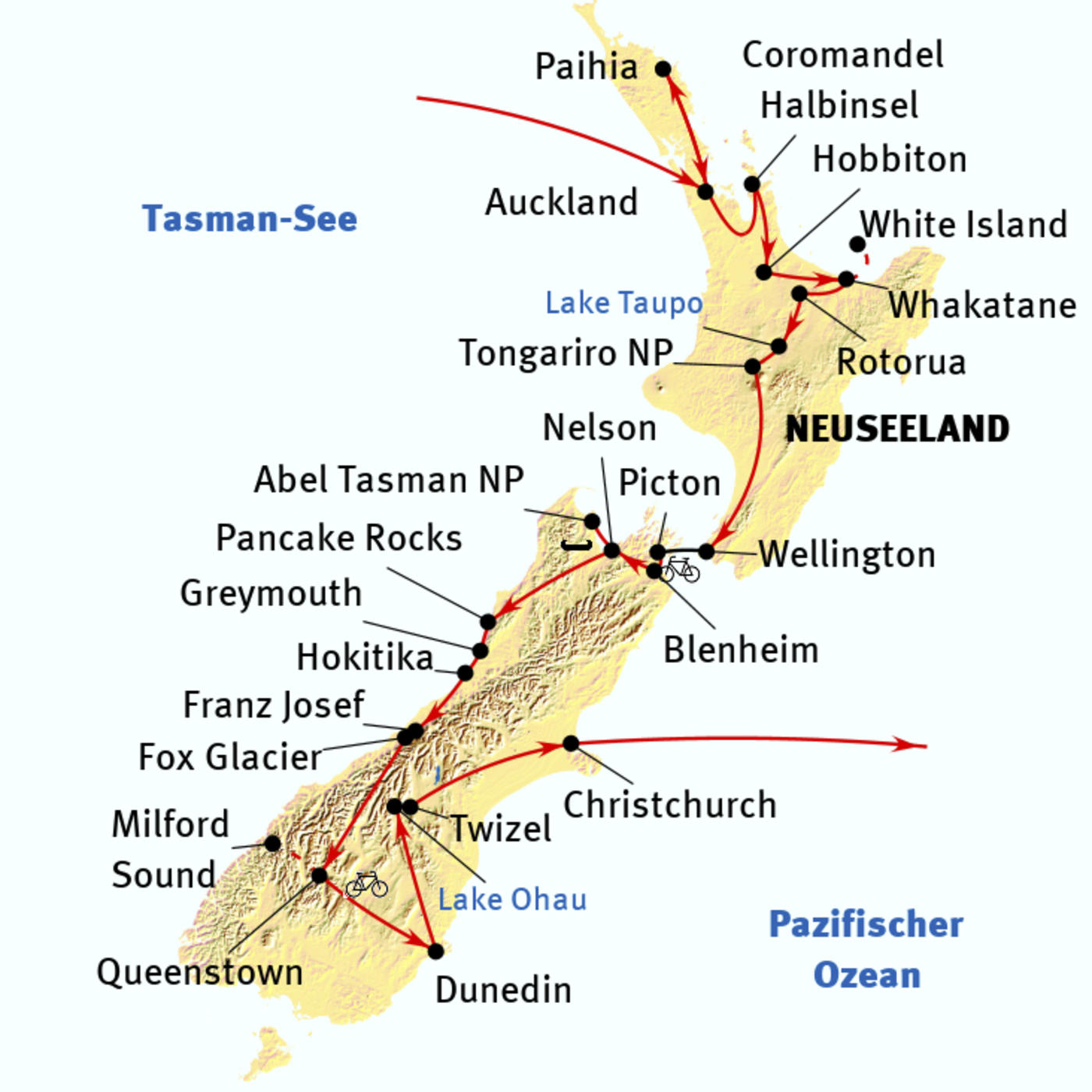 Auckland - Bay of Islands - Coromandel-Halbinsel - Hobbiton - Whakatane - Rotorua - Tongariro Nationalpark - Wellington - Picton - Blenheim - Nelson - Abel Tasman Nationalpark - Pancake Rocks - Hokitika - Franz Josef - Fox Glacier - Mount Aspiring Nationalpark - Queenstown - Dunedin - Lake Ohau - Lake Tekapo - Christchurch