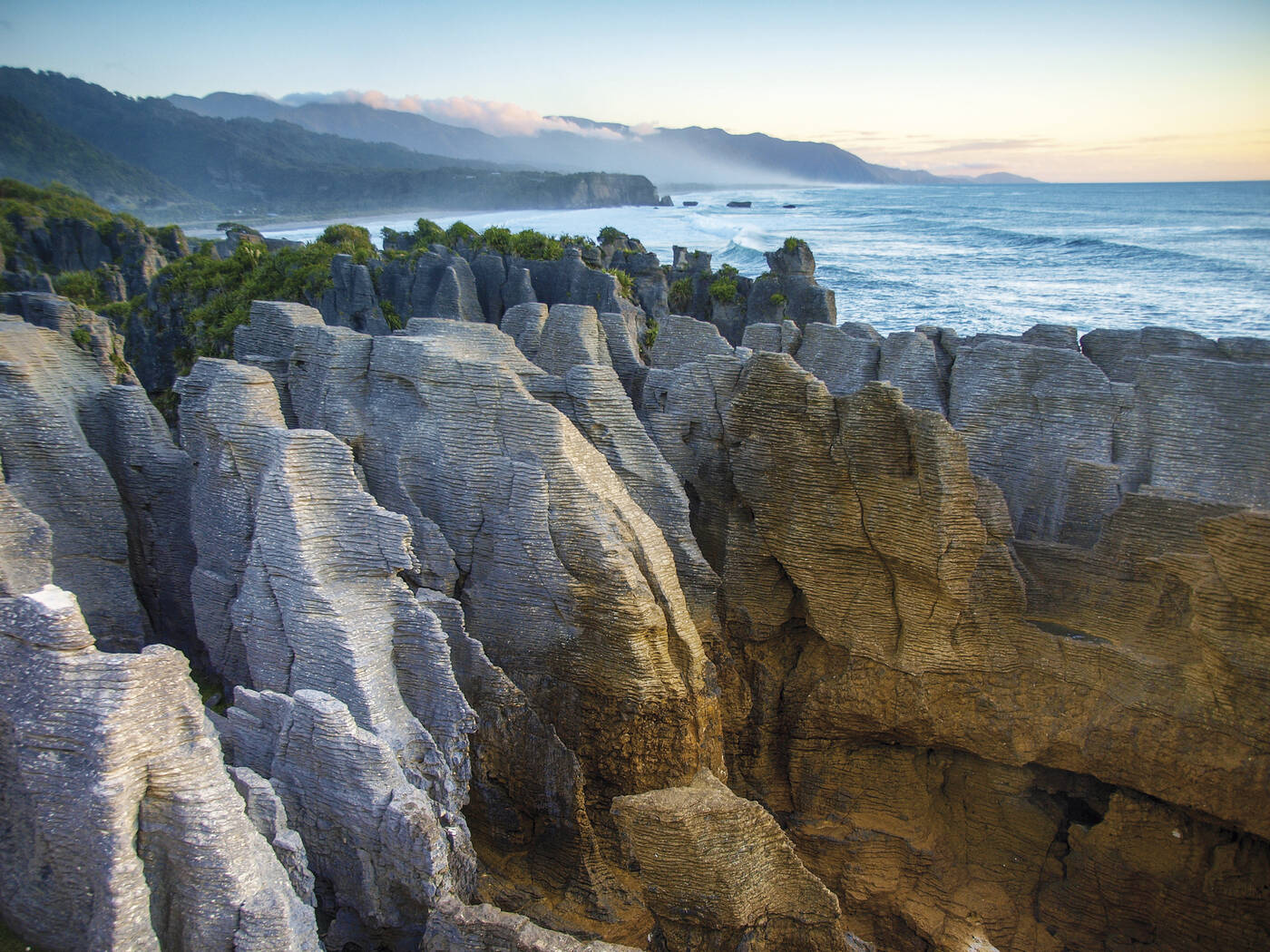 Die Busfahrt zur Gletscherzunge ist kurz, das Naturschauspiel großartig: aus zerklüfteten Eismassen rinnen graue Schmelzwasser durch satt grünen Regenwald – und bald darauf ins Meer. Weiter geht die Reise die immergrüne Westküste entlang nach Norden, über einst boomende Goldgräberorte wie Harihari und Ross. Ganz besonders „grünt“ es in Hokitika. Die Kleinstadt ist das Zentrum der Greenstone-Verarbeitung. Schon bei den Maori war neuseeländische Jade von besonderem Wert. Wir schauen in einer Werkstatt zu, wie die Steine zu Pretiosen geschliffen werden. Vielleicht finden wir hier ja ein persönliches Reiseandenken. Im Anschluss Weiterfahrt nach Punakaiki wo der heutige Tag für uns endet. (ca. 190km)