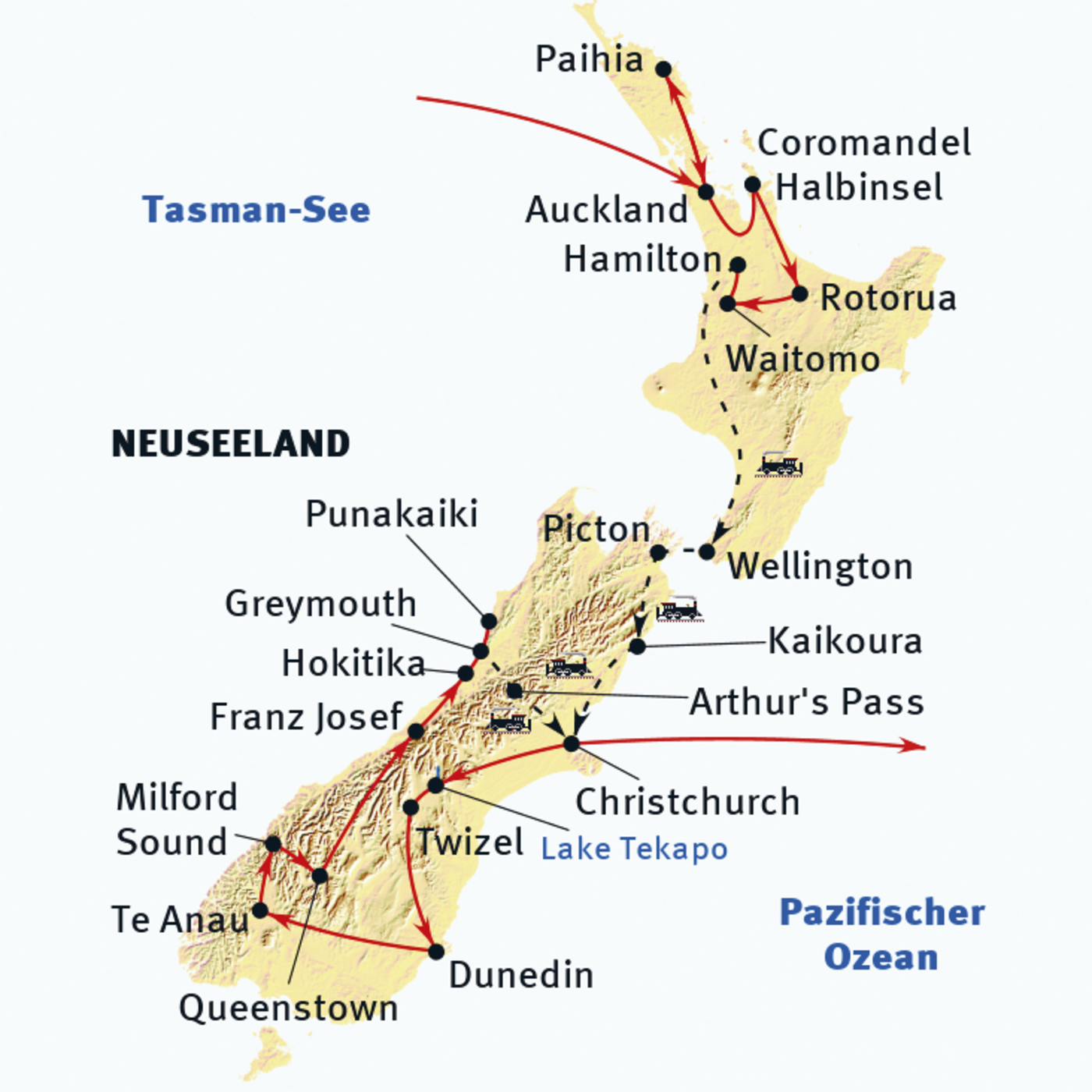 Auckland - Bay of Islands - DRIVING CREEK - Coromandel-Halbinsel - Rotorua - Hamilton - NORTHERN EXPLORER - Tongariro Nationalpark - Wellington - Picton - COASTAL PACIFIC - Christchurch - Lake Tekapo - Twizel - Dunedin - Te Anau - Milford Sound - Queenstown - Franz-Josef-Gletscher - Hokitika - Punakaiki - TRANZALPINE EXPRESS - Christchurch