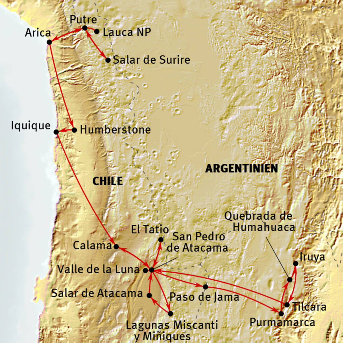 Arica - Putre - Salar de Surire - Lauca NP - Lago Chungará - Humberstone - Iquique - Calama - San Pedro de Atacama - Hochlandlagunen Miscanti & Miñiques - Salar de Atacama - Purmamarca - Quebrada de Humahuaca - Siebenfarbenberg - Iruya - Tilcara - El Tatio - Valle de la Luna