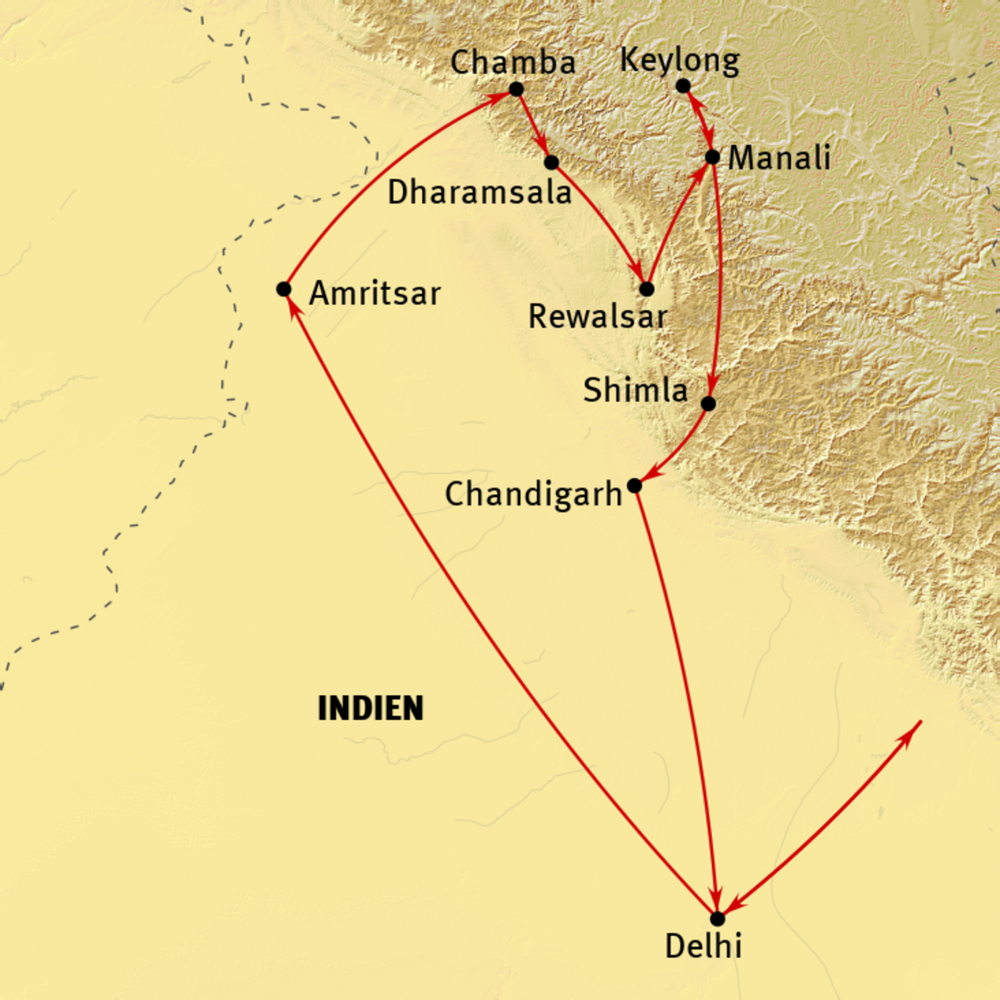 Himachal Pradesh, der Himalaya-Staat, einst Teil des historischen Punjab, begeistert durch eine abwechslungsreiche Landschaft von flachen Ebenen bis zu majestätischen Bergriesen. Besucher erwartet eine einzigartige Kombination aus idyllischen Bergstädten, Kulturschätzen und dem beeindruckenden Goldenen Tempel in Amritsar, alles eingebettet in eine reizvolle Natur. Das angenehme Klima der Berge bietet eine willkommene Erholung von der feuchten Hitze des Tieflands. Diese Reise durch Himachal Pradesh wird in landestypischen Fahrzeugen und in wohldosierten Etappen unternommen, über schmale Bergstraßen mit fantastischen Ausblicken. Sie richtet sich an Indienkenner und solche, die es werden möchten. Um Inlandsflüge zu vermeiden, wählen wir den Shatabdi Express, die originelle Eisenbahn, um von Delhi ins Gebirge und wieder zurück zu gelangen. So bildet schon die Anreise nach Amritsar ein besonderes Erlebnis.