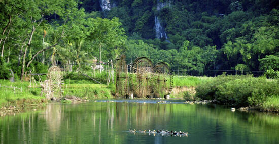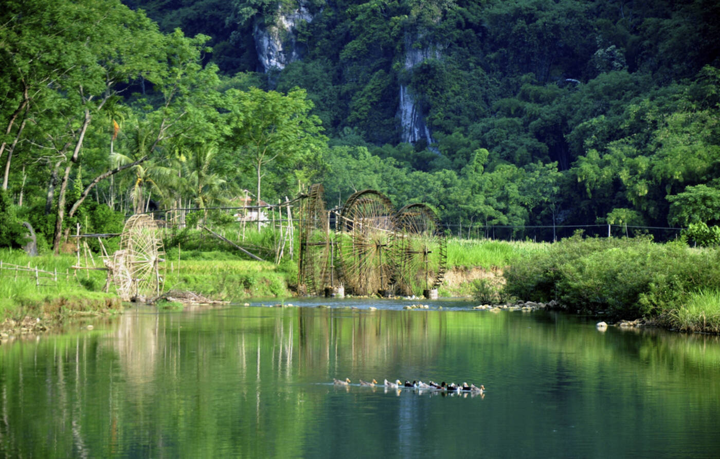 Auf landschaftlich reizvoller Strecke fahren wir über einen beeindruckenden Bergpass ins Pu Luong-Naturreservat und genießen weite Ausblicke über das Tal. Nach Ankunft in unserer Unterkunft und dem Mittagessen starten wir zu einer Wanderung entlang des Cham-Flusses. Wir überqueren eine Hängebrücke, spazieren durch Reisfelder und kleine Dörfer und entdecken unterwegs traditionelle Wasserräder, die das Flusswasser mit einfachen Bambuskonstruktionen in die Felder leiten, ein faszinierender Einblick in die lokale Bewässerungstechnik.