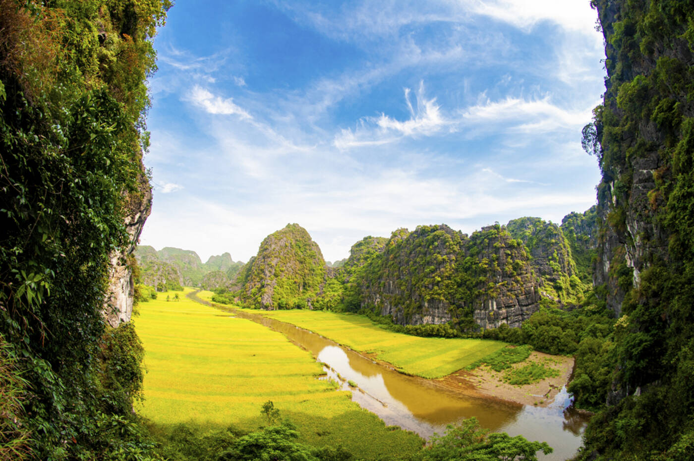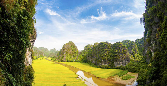 Wir fahren nach Ninh Binh, das südöstlich von Hanoi liegt und als Tor zu einer der reizvollsten Landschaften Vietnams gilt. Hier befand sich im 10. Jahrhundert mit Hoa Lu die erste Hauptstadt des Landes. Nach der Ankunft besuchen wir den Thai-Vi-Tempel, idyllisch zwischen Reisfeldern und Kalksteinfelsen gelegen und den Königen der Tran-Dynastie gewidmet. Anschließend unternehmen wir eine Bootsfahrt auf dem Ngo-Dong-Fluss durch Tam Coc, oft auch die „Trockene Halong-Bucht“ genannt. Vorbei an Reisfeldern und eindrucksvollen Karstformationen gleiten wir durch Felsenhöhlen und genießen die malerische Umgebung. Am späten Nachmittag besichtigen wir die an den Felsen gebaute Bich-Dong-Pagode. Über Steinstufen erreichen wir die drei Ebenen der Anlage und genießen herrliche Ausblicke über die Landschaft.