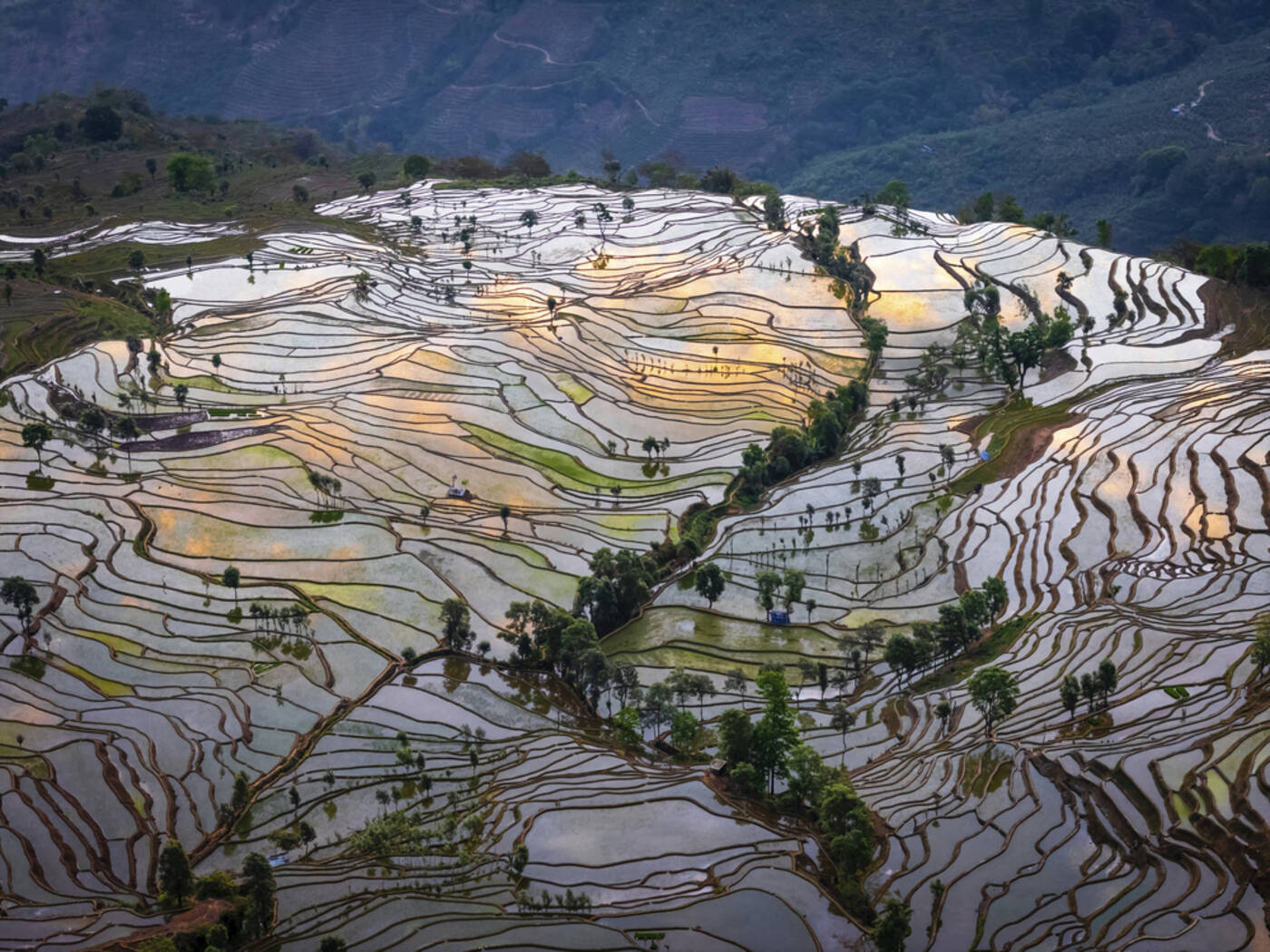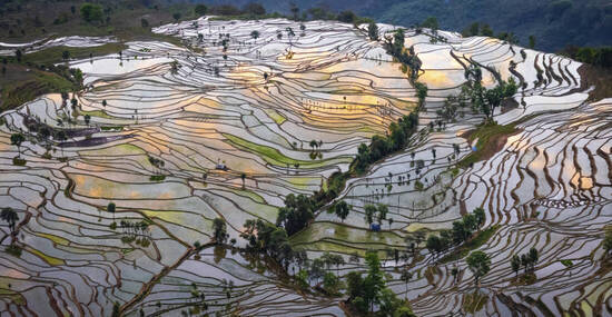 Nach den Grenzformalitäten begrüßt uns unsere deutschsprachige Reiseleitung in China. Wir fahren direkt weiter in das kleine Städtchen Yuanyang. Unterwegs genießen wir ein Mittagessen in einem lokalen Restaurant und erleben die abwechslungsreichen Landschaften Yunnans. Yuanyang liegt auf rund 1.800 Metern Höhe und bietet atemberaubende Ausblicke auf die berühmten Reisterrassen. Besonders im gefluteten Zustand spiegeln sie das Licht wie gewaltige Naturspiegel. Die Region ist nicht nur landschaftlich reizvoll, sondern auch Heimat der ethnischen Minderheiten der Yi und Hani. Einer Legende nach waren die Hani die ersten, die hier Terrassenfelder anlegten. (300 km)