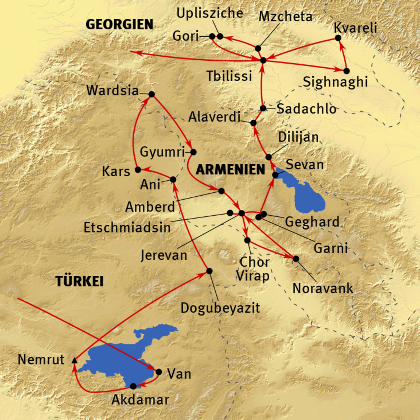 Türkei: Van - Akdamar - Nemrut - Ahlat - Dogubeyazit - Ani - Kars - Georgien: Wardsia - Armenien: Gymri - Amberd - Jerevan - Etschmiadsin - Zvartnots - Chor Virab - Noravank - Geghard - Garni - Sevan - Alaverdi - Haghpat - Sanahin - Georgien: Tbilissi - Signagi - Kvareli (Kachetien) - Mzcheta - Uplisziche - Gori - Tbilissi