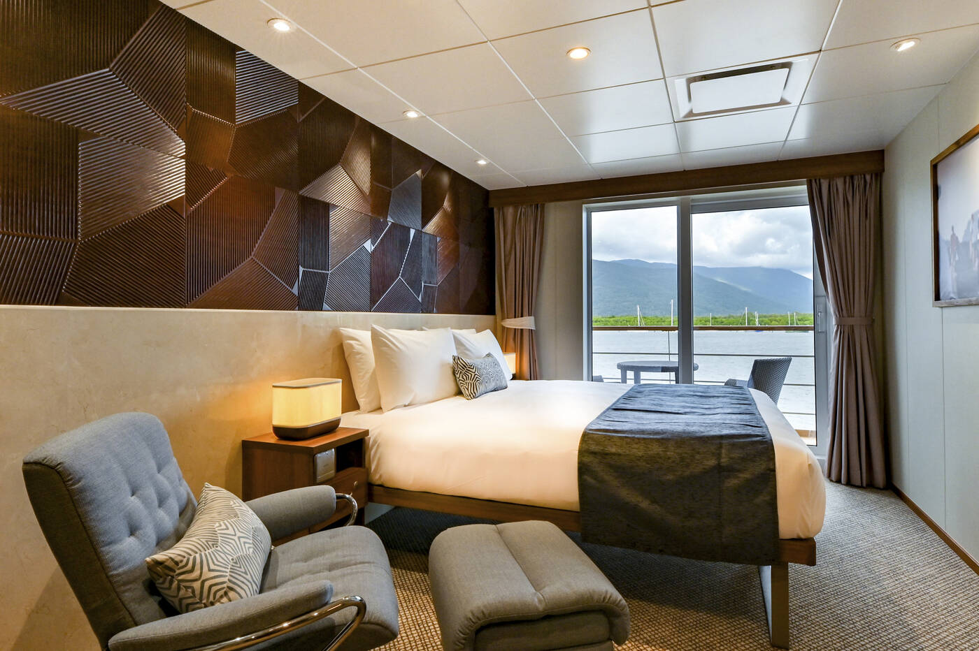 - Kat. D = Bridge Deck Balcony Stateroom, Zweibettkabine | Deck 5 | ca. 37,5 m² // Doppelbett (kann separiert werden), 3,5 m² Balkon mit Liegen, Sitzgelegenheit und Tisch, "Horizon Badezimmer", Sofagarnitur, ausreichend Stauraum, Minibar