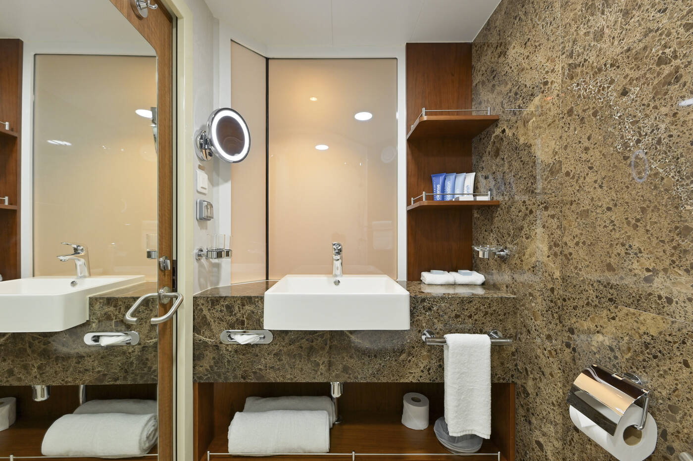 - Kat. B = Promenade Deck Stateroom, Zweibettkabine | Deck 3 | ca. 17 m² // Doppelbett (kann separiert werden), Fenster, Dusche/WC, Stuhl, ausreichend Stauraum