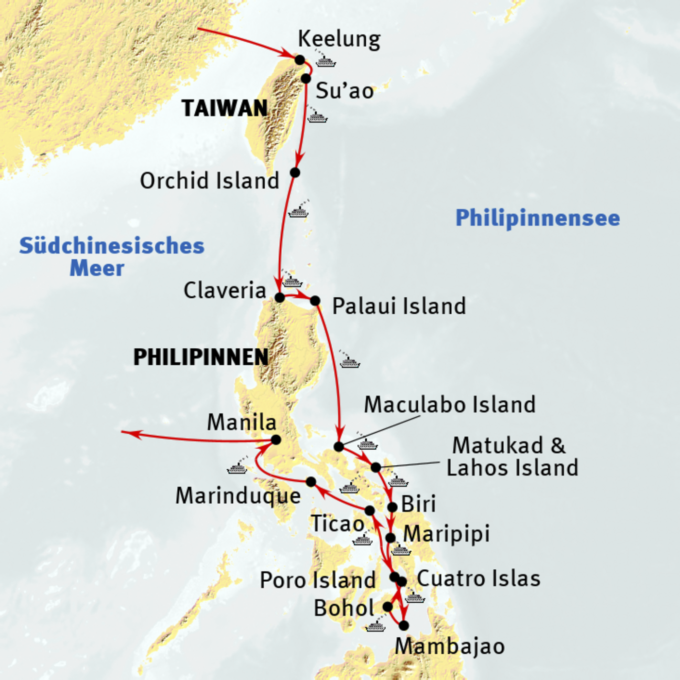 Keelung - Su’ao - Orchid Island - Claveria - Pilaui Island - Maculabo Island - Matukad & Lahos Island - Biri - Maripipi - Poro Island - Mambajao - Bohol - Cuatro Islas - Ticco - Marinduque - Manila
