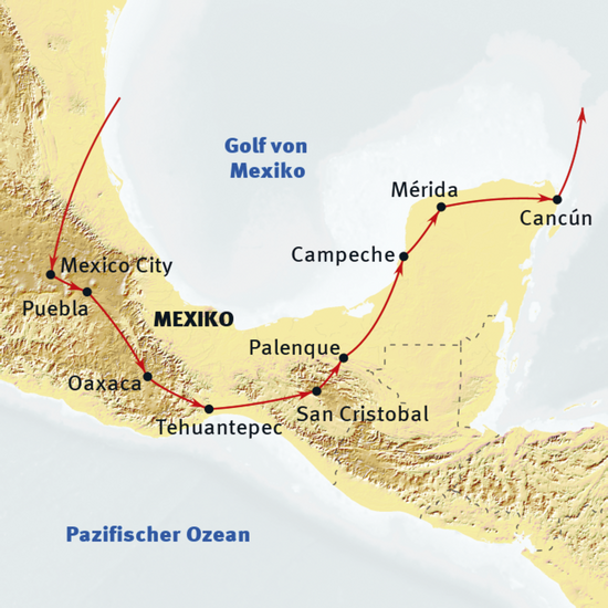 - die Route entspricht dem klassischen Weg von Mexiko City bis Cancún mit allen wichtigen Höhepunkten auf der Strecke