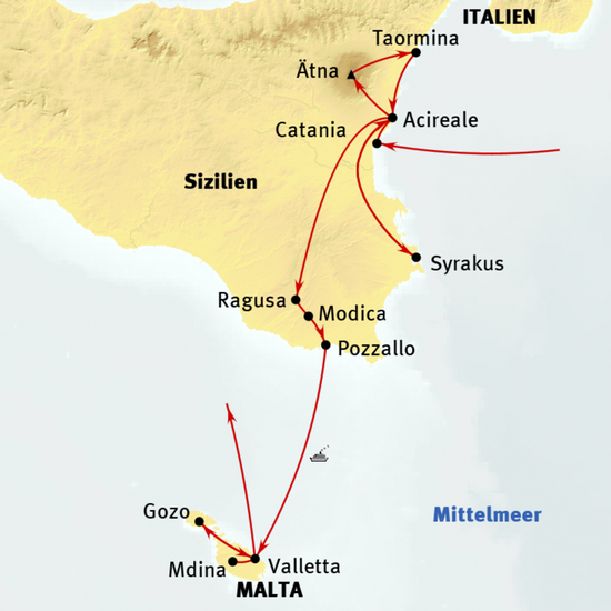- Achttägige Entdeckerreise ins Herz des Mittelmeers – zu den Inseln Sizilien und Malta