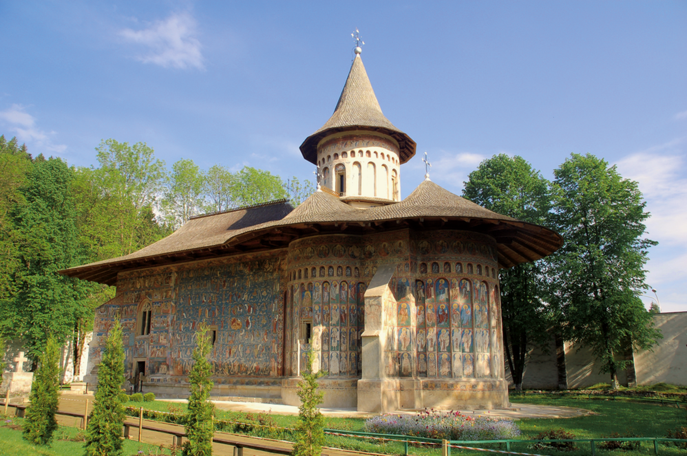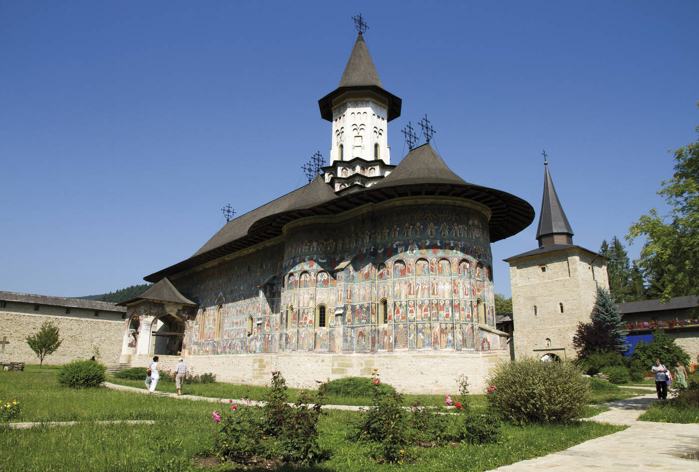 Zunächst ein Rundgang in Targu Mures (Neumarkt) mit orthodoxer Kathedrale, Rathaus und Kulturpalast mit seinen bunten Dachziegeln. Weiterfahrt und in Bistrita kurzer Halt für einen Bummel durch die Altstadt mit der evangelischen Kirche. Weiter über den Tihuta-Pass und die wilden Ostkarpaten – in dieser Landschaft siedelte Bram Stoker seinen berühmten Dracula-Roman an – mit Fotostopp an einer besonders schönen Stelle, in den nördlichen Teil der Moldau, die Bukovina. Hier unser Hotel bei Voronet.