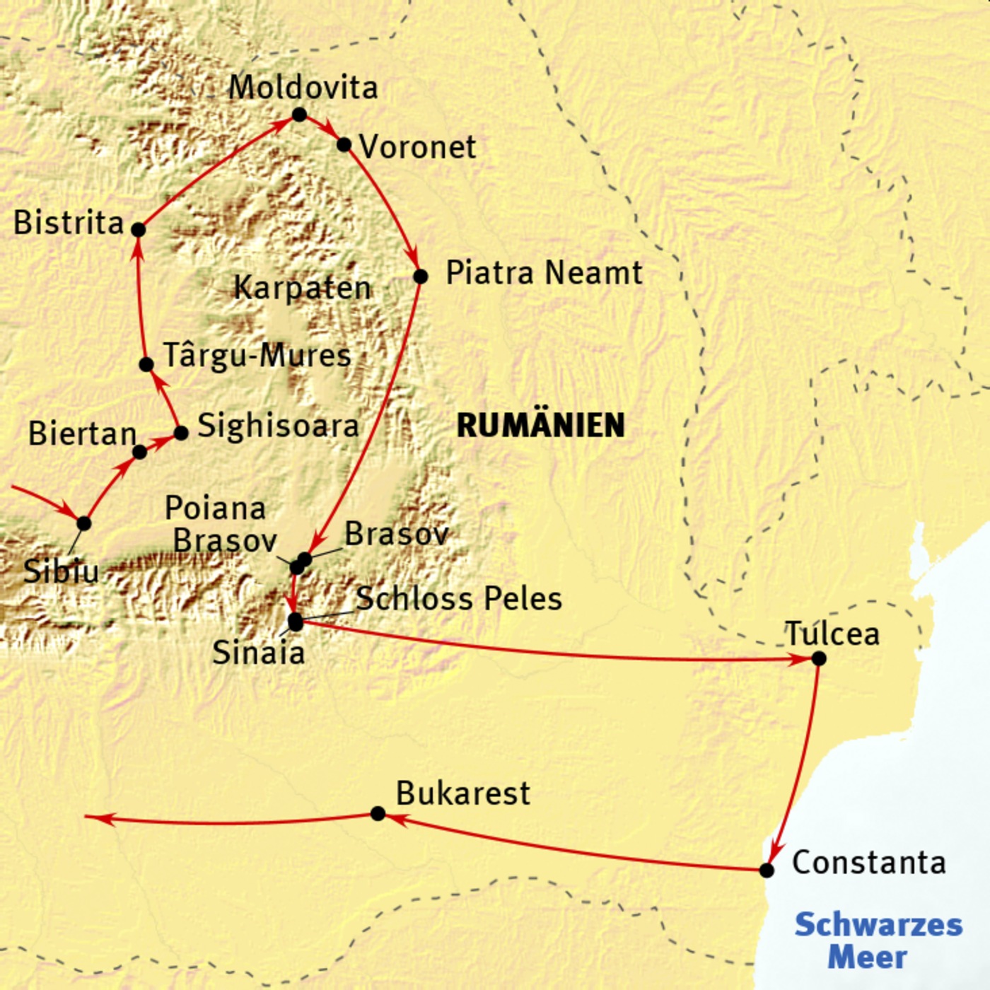 Sibiu - Biertan - Sighisoara - Targu Mures - Bistrita - Moldauklöster (Moldovita - Voronet) - Neamt - Bicaz Klamm - Brasov - Poiana Brasov - Sinaia (Peles) - Tulcea - Donaudelta - Constanta - Bukarest
