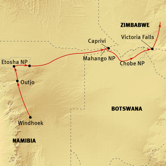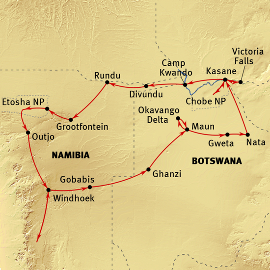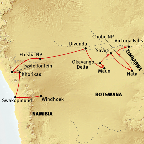 - über Etosha und Caprivi geht es zum Chobe-Nationalpark in Botswana