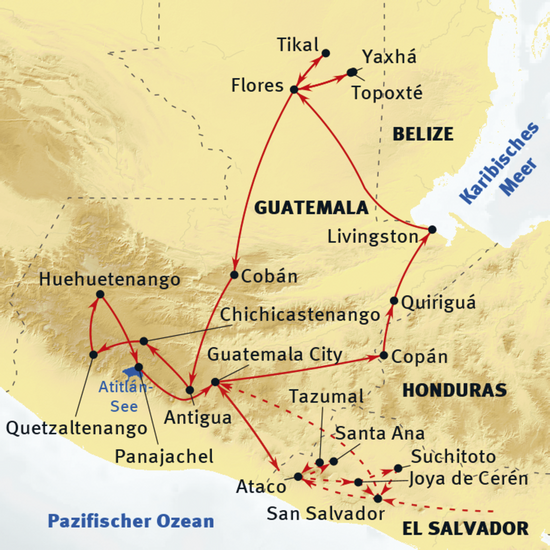 Die meisten Reisen beginnen in Guatemala-Stadt oder in der charmanten Kolonialstadt Antigua, die mit ihren pastellfarbenen Häusern, Kopfsteinpflasterstraßen und historischen Kirchen als eines der schönsten Reiseziele des Landes gilt. Hier bleibt Zeit für den Besuch des zentralen Platzes mit der imposanten Kathedrale und des ehemaligen Klosters Santo Domingo.