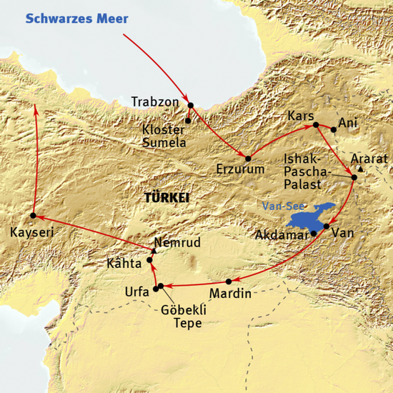 - Trabzon am Schwarzen Meer, Ani unterhalb des Ararat, zum Van-See, zum Fluss Tigris und bis nach Kayseri in Kappadokien