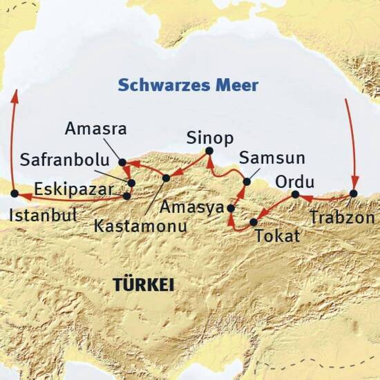 Die Rundreise an der Schwarzmeerküste, abseits der Touristengebiete, ist unser Geheimtipp. Hier findet man noch typisches türkisches Leben, unberührte Natur und idyllische Küstenorte mit herrlichen Stränden. Die Gruppenreise startet in Trabzon mit dem Sumela Kloster, verläuft weiter entlang der wunderschönen Küste mit Besichtigungen in Ordu, Tokat und Amasya. Weitere Besichtigungen auf der Rundreise sind Samsun, Sinop, Kastamonu, Amasra und Safranbolu. Die Reise endet in Istanbul.