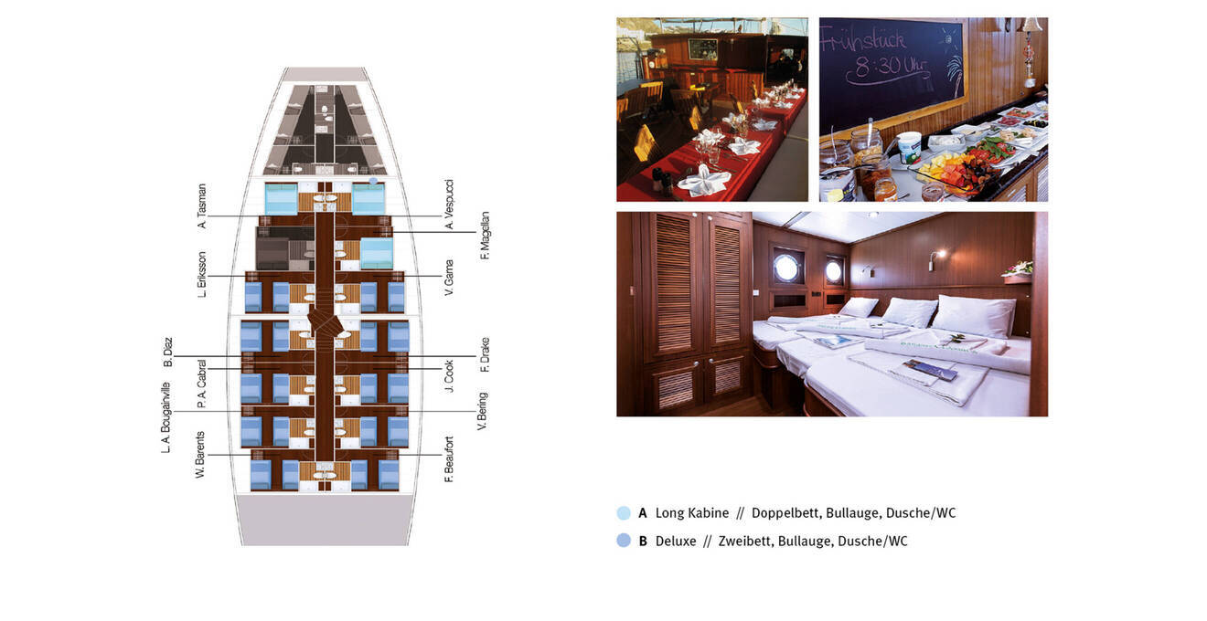 Die Taufe der RHEA ist am 30. April 2017, direkt vor dem antiken Heiligtum von Delos vor Anker liegend, erfolgt. An Bord erwartet uns eine hervorragende Küche. Die Crew sorgt bestens für unser leibliches Wohl. Frühstück an Deck oder ein Aperitif im Salon lassen den Tag entspannt beginnen und den Abend gemütlich enden. Tagsüber genießen wir die Weite der Weltmeere und wer möchte, kann die Crew beim Segeln unterstützen. Die Kabinen der RHEA sind nach Entdeckern benannt. Die 13 Kabinen haben ein eigenes Bad/WC mit Duschkabine.