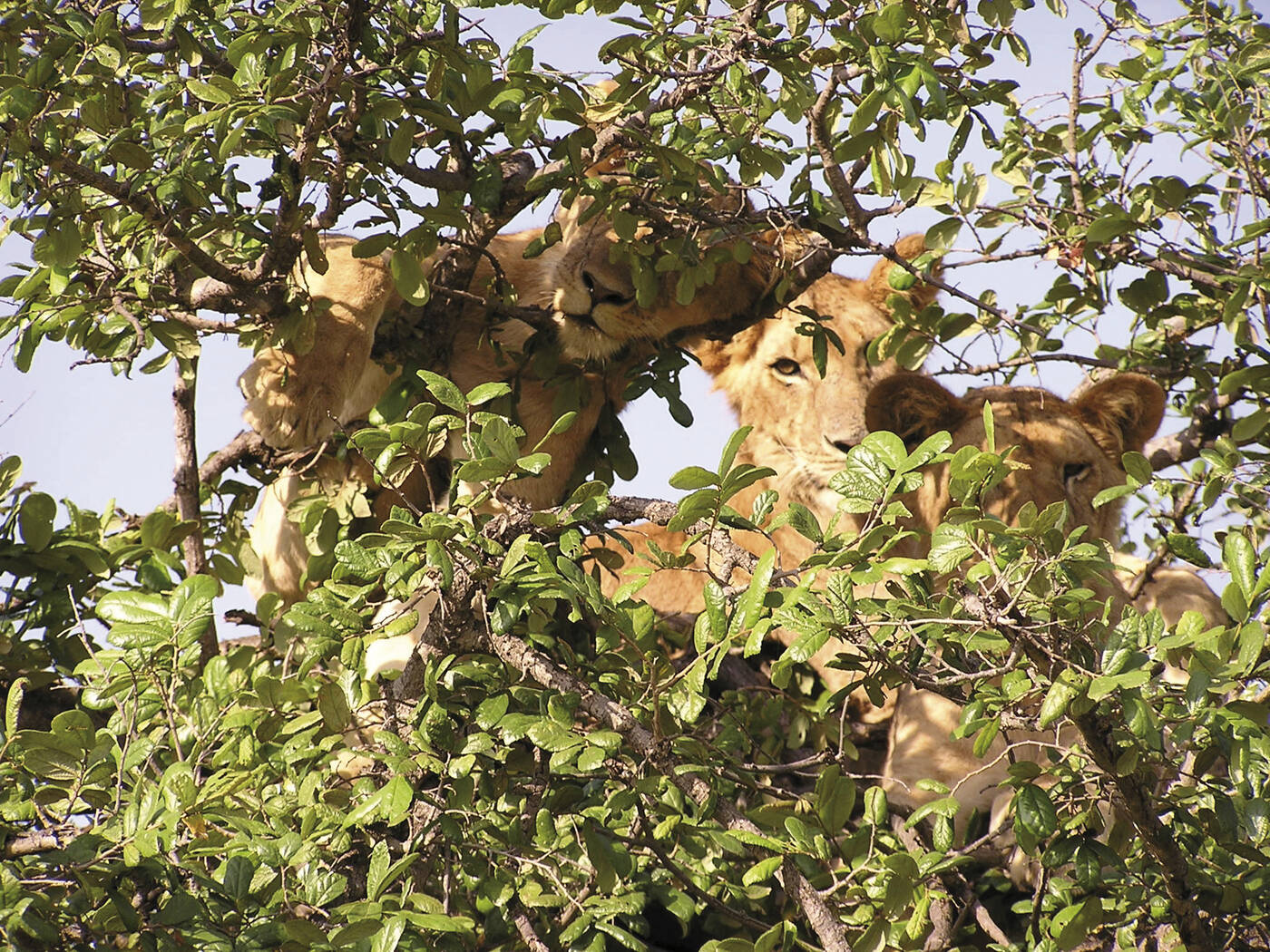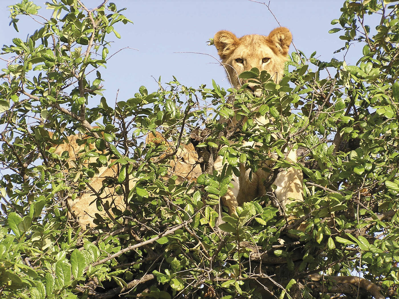 Mit Kamera und Picknick-Mittagessen ausgestattet, geht es nach dem frühen Frühstück ab in den Busch zur Tierbeobachtung – oder beobachten die Tiere uns? (So manch tierischer Gesichtsausdruck ließe dies vermuten!) In diesem kleinen, aber sehr wildreichen Schutzgebiet wandern die Tiere kaum ab, denn die Lebensader – der Tarangire-Fluss – führt fast ganzjährig Wasser. Hier sieht man öfters Leoparden, auch Boas, die zusammengeringelt im Baum liegen. Eine Besonderheit des Parks: eine stattliche Anzahl der Büschelohr-Spießböcke und Afrikas Riesenbäume, die Baobabs.
