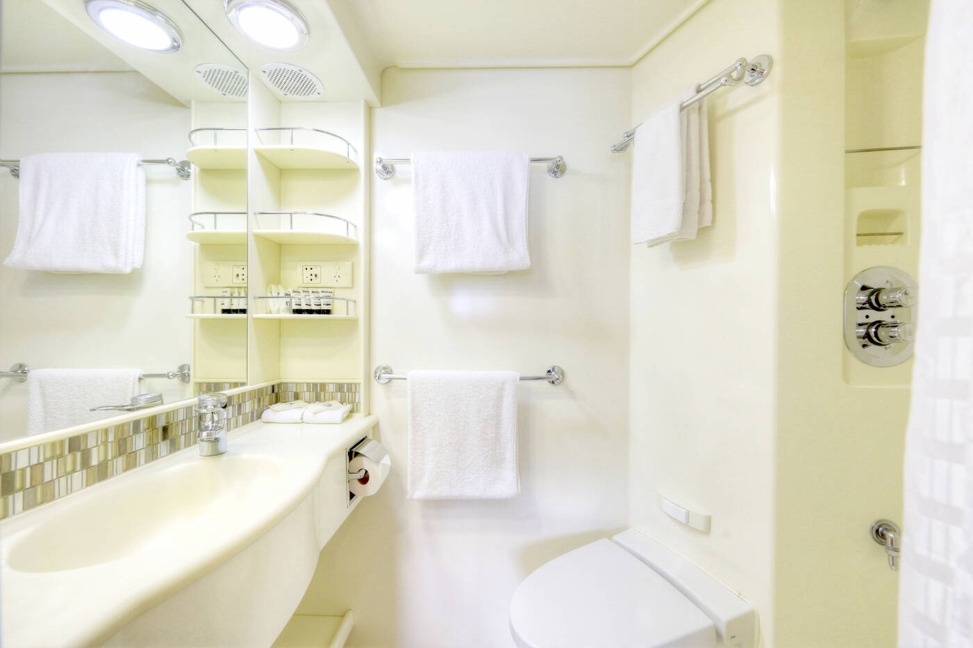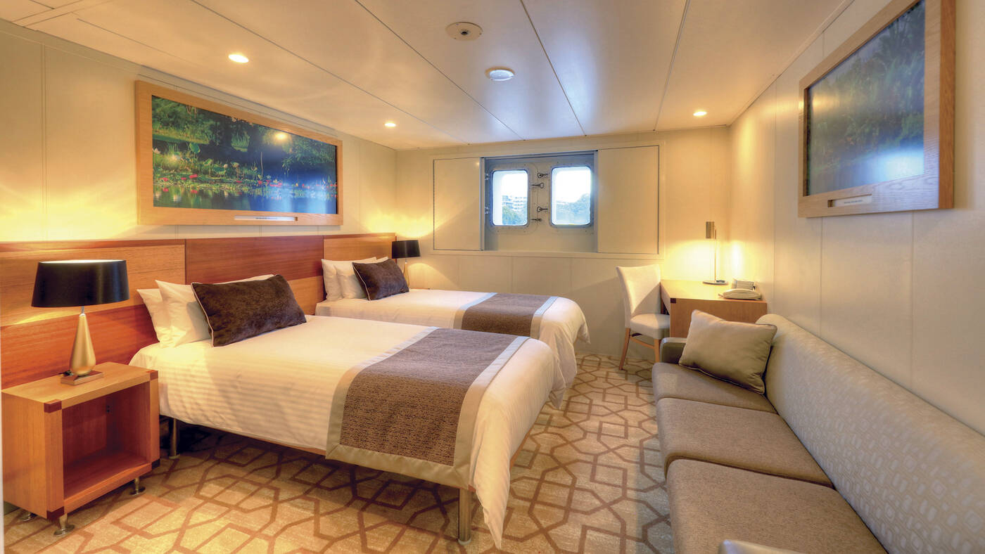 - Kat. A = Main Deck Stateroom, Zweibettkabine | Deck 2, vorne | ca. 18 m² // Doppelbett (kann separiert werden), Bullauge, Dusche/WC, Stuhl, Tisch, Sofa