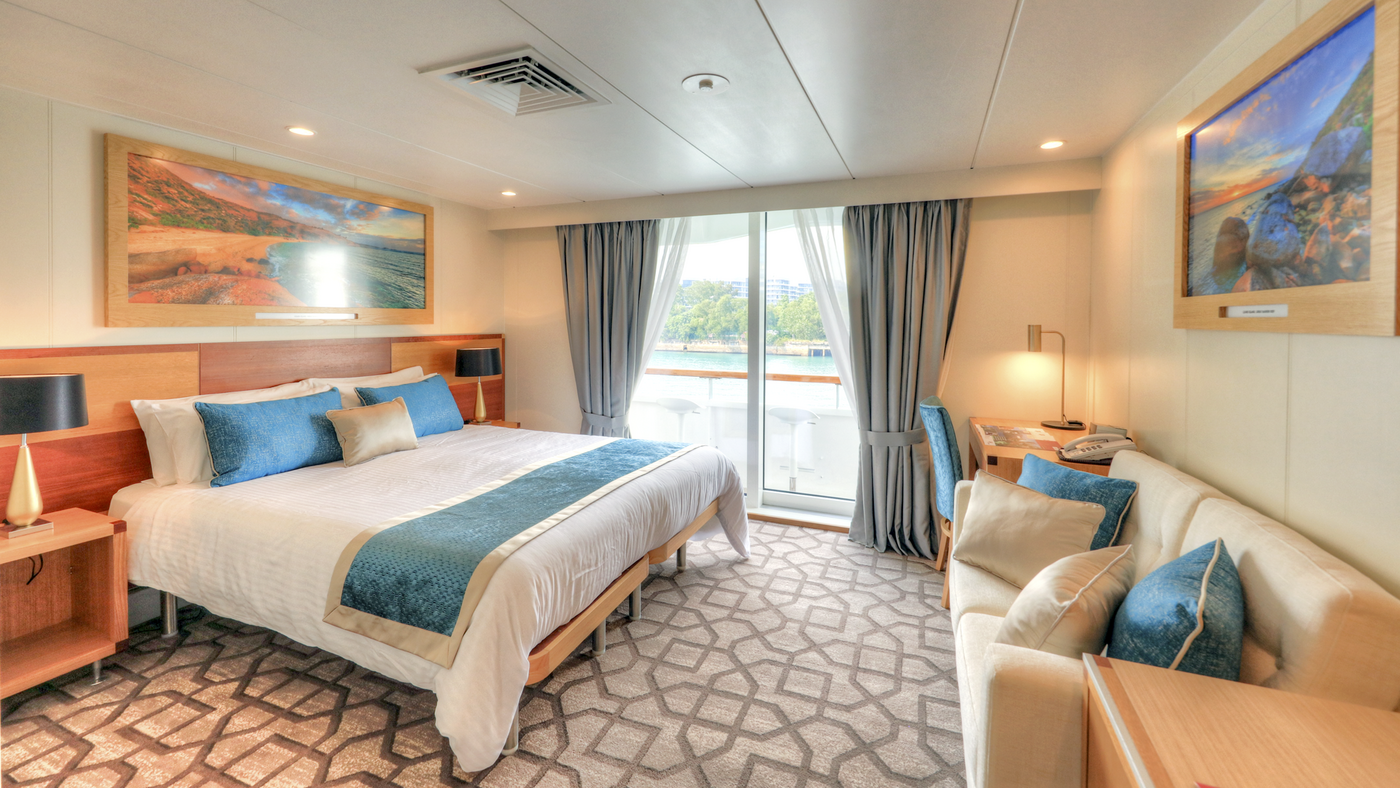 - Kat. E = Bridge Deck Balcony Suite, Zweibettkabine | Deck 4 | ca. 20 m² // Doppelbett (kann separiert werden), Balkon mit Sitzgelegenheit, , Dusche/WC, Stuhl, Tisch, Sofa