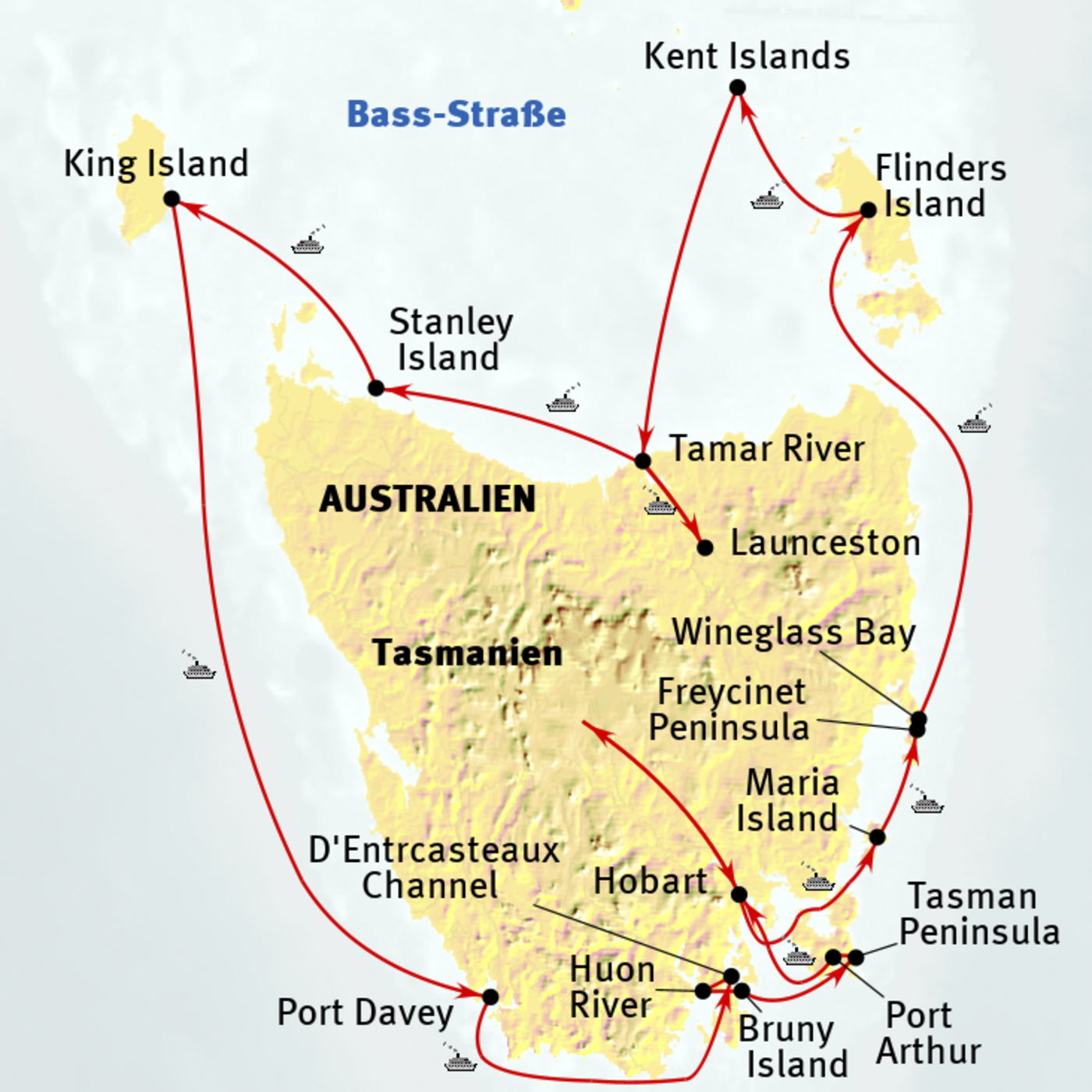 Hobart - Maria Island - Frexcinet Peninsula - Wineglass Bay - Flinders Island - Kent Islands - Tamar River - Launceston - Stanley Island - King Island - Port Davey - D'Entrcasteaux Channel - Huon River - Bruny Island - Tasman Peninsula - Port Arthur - Hobart