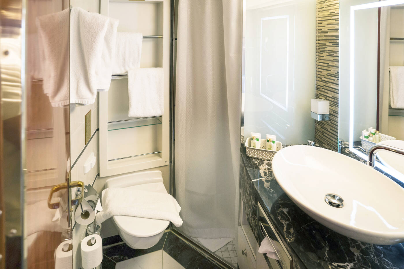 - Kat. D = Deluxe-Suite ca. 24 m² | Sportsdeck // Außenkabine mit Privatbalkon, Queensize-Bett oder zwei Einzelbetten, begehbarer Kleiderschrank, Safe, Kühlschrank, TV, individ. Temperaturreglung, Föhn