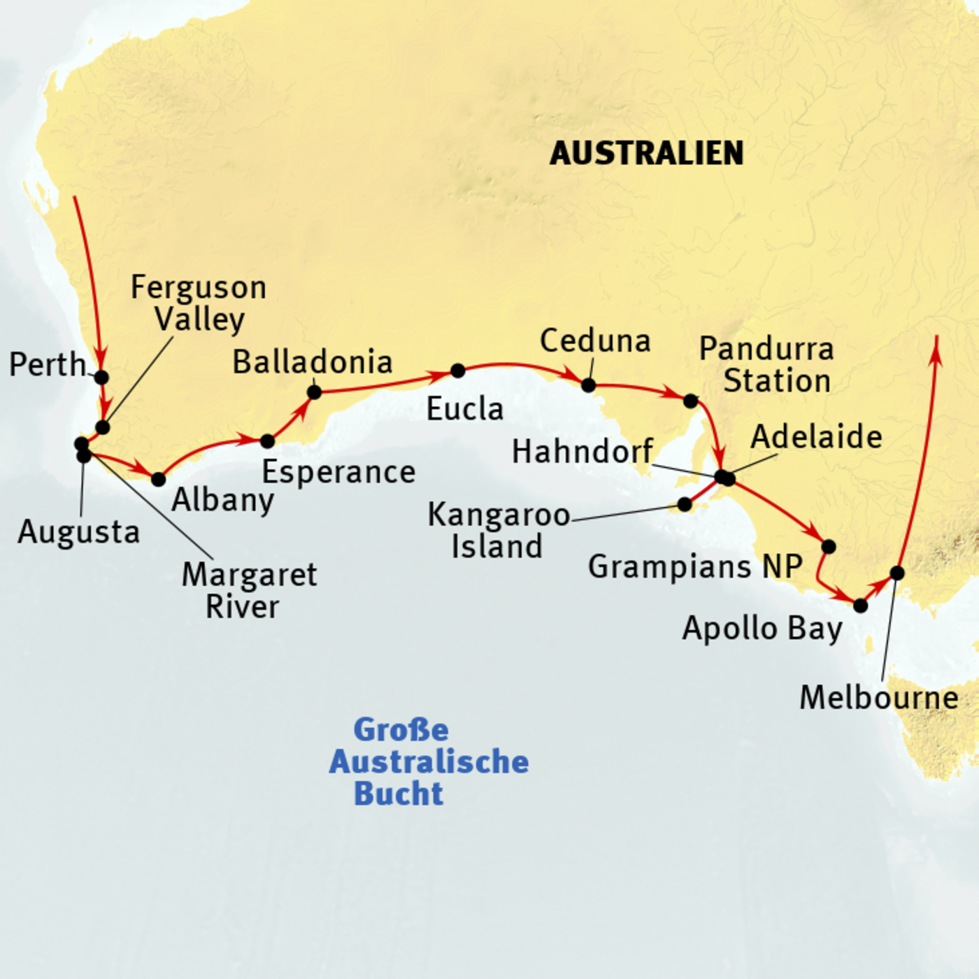 Perth - Fremantle - Ferguson Valley - Margaret River - Augusta - Albany - Esperance - Balladonia - Eucla - Ceduna - Pandurra Station - Adelaide - Kangaroo Island - Hahndorf - Grampians Nationalpark - Great Ocean Road - Apollo Bay - Melbourne