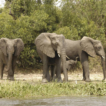 Die geographisch sehr reizvolle Fahrt hinüber zum Queen Elisabeth NP (130 km) führt uns zunächst auf einer einsamen Piste durch die Kasenda Krater Seen. Die vor 11000 Jahren entstandene Erdoberfläche wirkt aus der Vogelperspektive wie ein von Wasserpfützen gefüllter Eierkarton: malerische Seen in allen Farbschattierungen von smaragd-grün bis tiefblau liegen in zufälliger Anordnung eingebettet in einem wilden Relief von Kraterhöhen. Der äußerst fruchtbare Boden beschenkt die Menschen mit Tee und Kaffee, Bananen, Avocados und Mangos. Weiter westlich, entlang der mit Gletschereis geschmückten Ruwenzori Berge, erleben wir "Erdgeschichte zum Anfassen". Die auch als "Mondberge" bezeichneten, über 5000 Meter hohen Gipfel sind das Resultat des Aufeinandertreffens der afrikanischen mit der arabischen Kontinentalplatte und sind deshalb nicht vulkanischen Ursprungs wie die im Süden gelegenen Virunga-Berge. Nach rund 3 Stunden Fahrzeit überqueren wir den Äquator und betreten den 1978 qkm großen Queen Elizabeth Nationalpark. 3000 Elefanten, 15000 Kaffernbüffel, 4000 Flusspferde, 12000 Grasantilopen (Uganda Kobs), Topis, Wasserböcke und sogar die mit Schwimmhäuten ausgestattete Sitatunga-Antilope sind hier beheimatet. Auch Raubtiere wie Löwen und Leoparden, Hyänen und Schakale gehören zur Queen Elizabeth Tierfamilie. Mit großer Wahrscheinlichkeit werden wir schon auf dem Weg zu unserer Lodge Elefanten und Büffel antreffen. Am Nachmittag sind wir mit einem Safari Boot unterwegs auf dem Kazinga-Kanal. Zwischen Lake George und Lake Edward erwartet uns die klassische afrikanische Tierwelt Elefant, Krokodil, Büffel, Flusspferd, die zur Tränke an das Wasser drängen. Der Tag klingt aus mit einem Sundowner auf der Terrasse unseres Luxus-Hotels mit weitem Blick über den Edward See bis hinüber zu den grauen Bergen auf der Kongo-Seite des Sees.