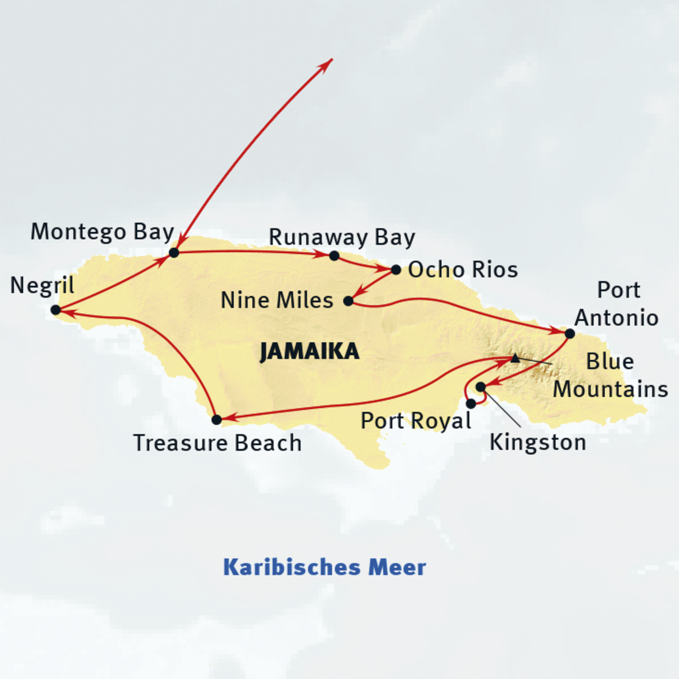Montego Bay - Runaway Bay - Ocho Rios - Nine Miles - Port Antonio - Kingston - Port Royal - Blue Mountains - Treasure Beach - Negril
