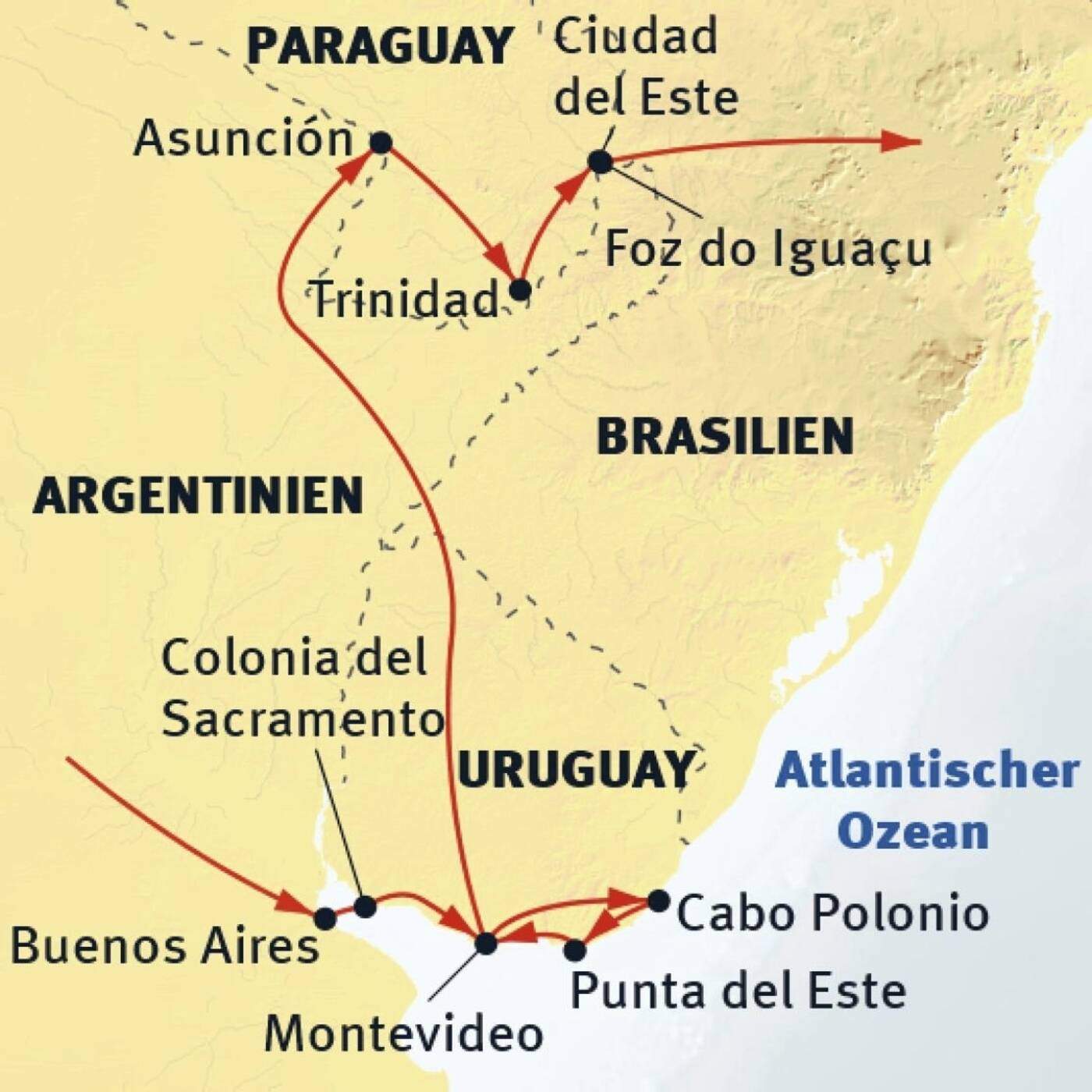 Buenos Aires - Colonia del Sacramento - Montevideo - Guardia del Monte - Cabo Polonio - Punta del Este - Asunción - Chaco - Trinidad - Iguassú
