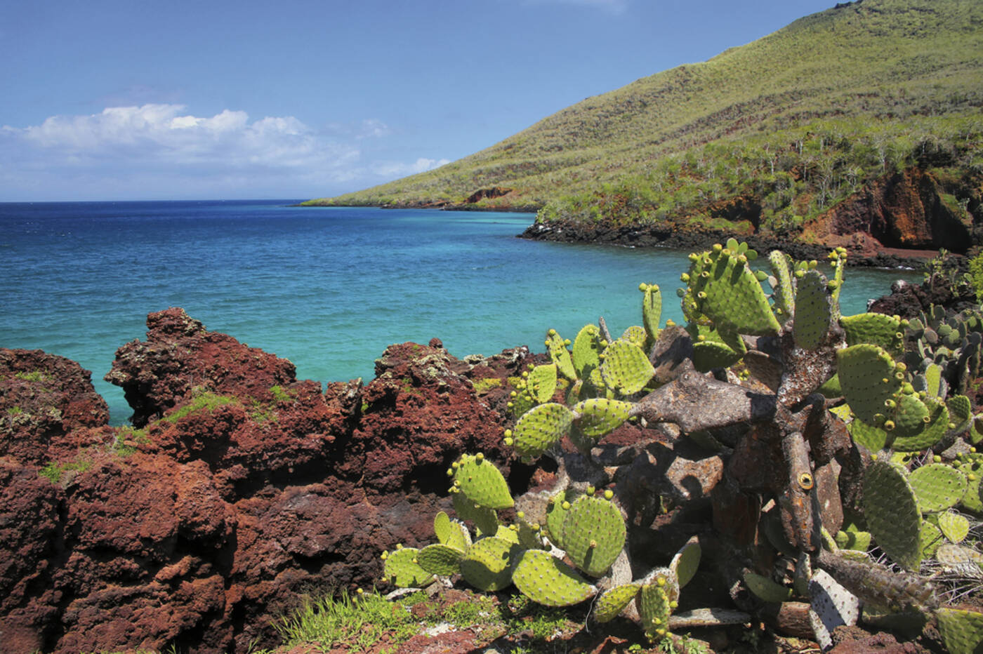 Vorm. Ausflug nach Plaza Sur, eine kleinere Insel mit baumhohen Opuntien, goldfarbenen Landleguanen und einer großen Seelöwenkolonie. Anschl. Schnorchelgelegenheit. Nachm. „nasse“ Landung auf Santa Fe und Spaziergang durch einen Kakteenwald zu den Santa Fé Landleguanen.