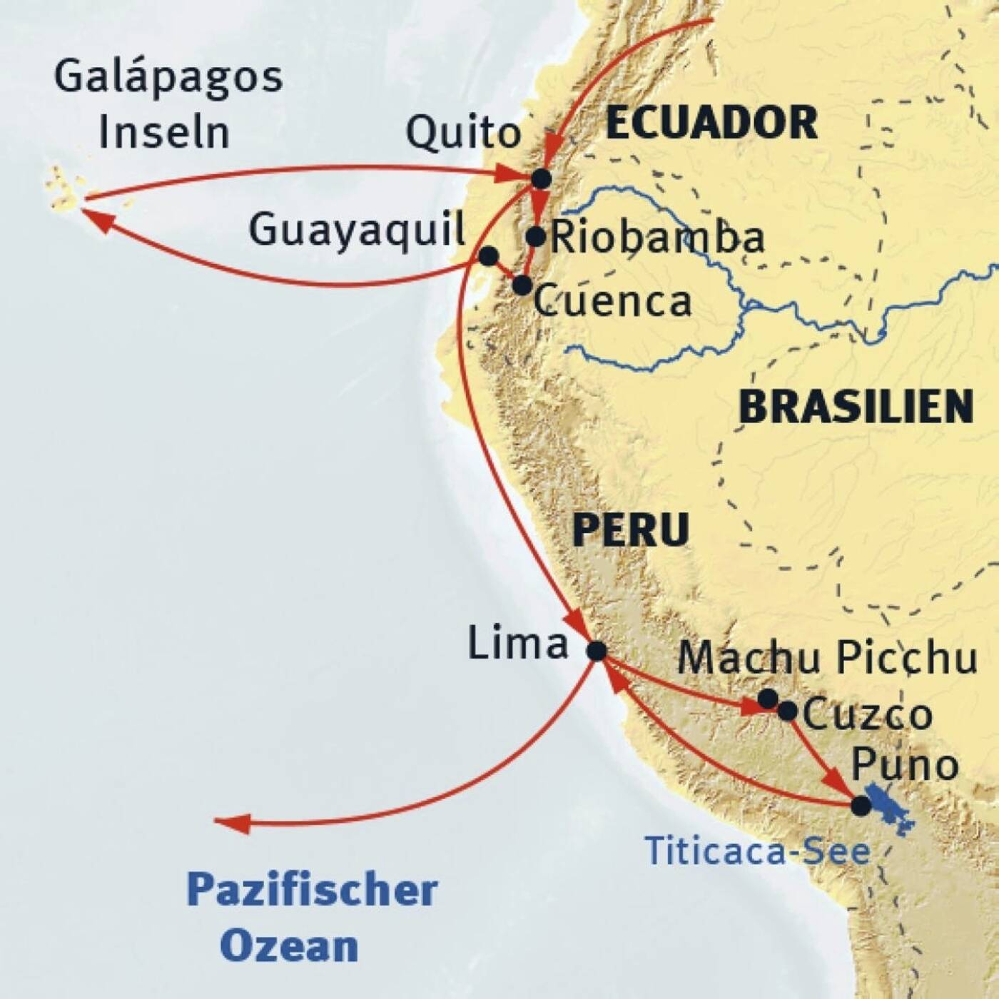 Der südamerikanische Kontinent bietet dem Besucher eine Vielzahl von Attraktionen, sodass sich alle Südamerika-Rundreisen bei der Auswahl ihrer Ziele spürbar beschränken müssen. Möchte man eine Hitliste der Traumziele erstellen, wären die Galápagos-Inseln und die Inka-Kapitale Cusco mit Machu Picchu sicherlich an vorderster Stelle. Natur-Liebhaber bevorzugen Galápagos, Kulturbegeisterte Machu Picchu mit seinem historischen Umfeld. Diese beiden überragenden Ziele haben wir bei dieser Reise mit weiteren Highlights in Ecuador und Peru zu einem dreiwöchigen Programm kombiniert.