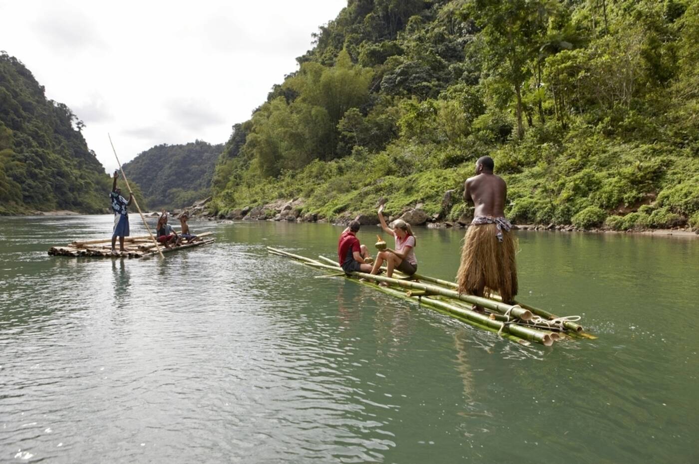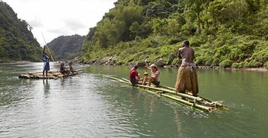 Ganztagesausflug (deutschsprachig) in das Bergland von Namosi: Von Navua aus fahren wir mit traditionellen Langbooten auf dem gleichnamigen Fluss in das Landesinnere, vorbei an Dörfern, unberührtem tropischem Regenwald, tiefen Schluchten und zahlreichen Wasserfällen. Ziel ist das Dorf Raiwaqa, wo wir traditionell begrüßt werden und an der Kava-Zeremonie teilnehmen. Zum Mittag genießen wir das klasssiche Erdofen-Essen, "Lovo" genannt. Am Nachmittag haben wir Gelegenheit zu einem erfrischenden Bad an einem Wasserfall und fahren per Bambus-Floß wieder zurück an unseren Ausgangspunkt.