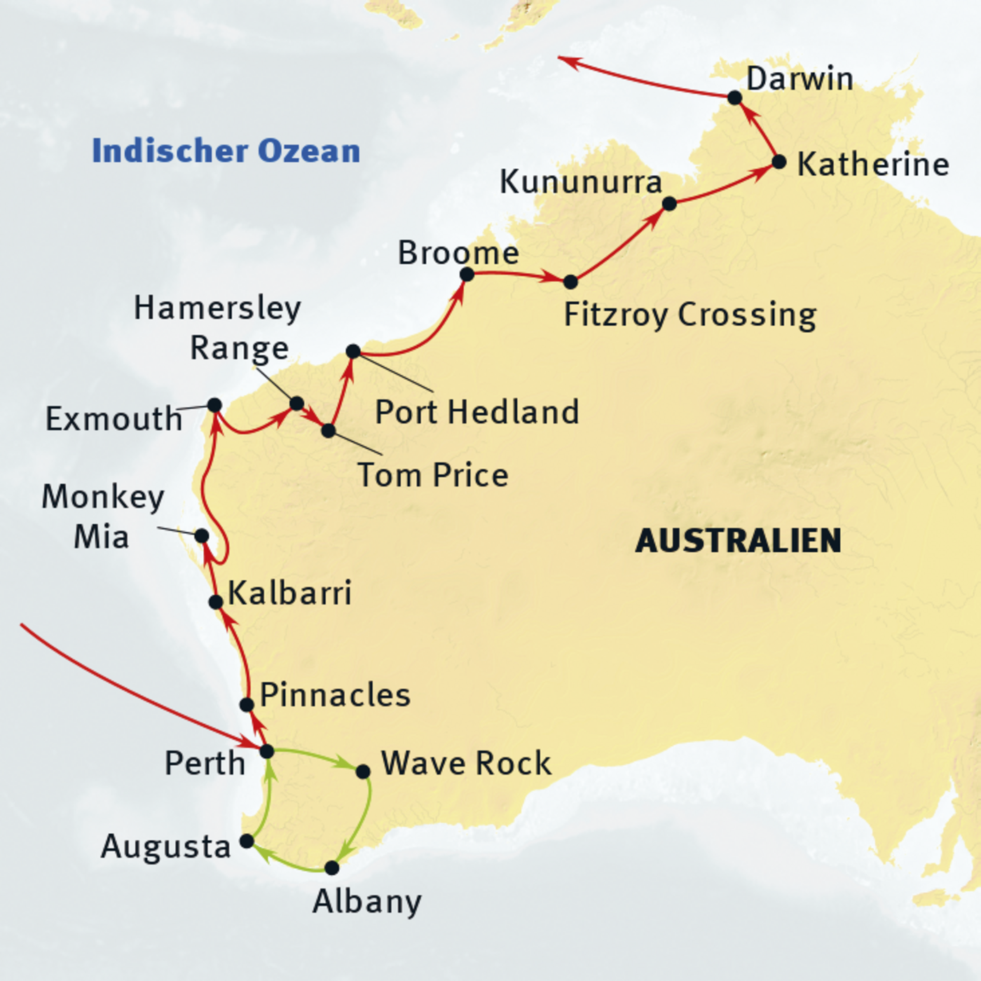 Perth - Augusta - Margaret River - Albany - Wave Rock - Hyden - Pinnacles - Geraldton - Kalbarri Nationalpark - Monkey Mia - Carnavon - Coral Bay - Ningaloo Reef - Hamersley Ranges - Karijini-Nationalpark - Port Hedland - 80 Mile Beach - Broome - Derby - Kimberleys - Bungle Bungle - Katherine Gorge - Darwin