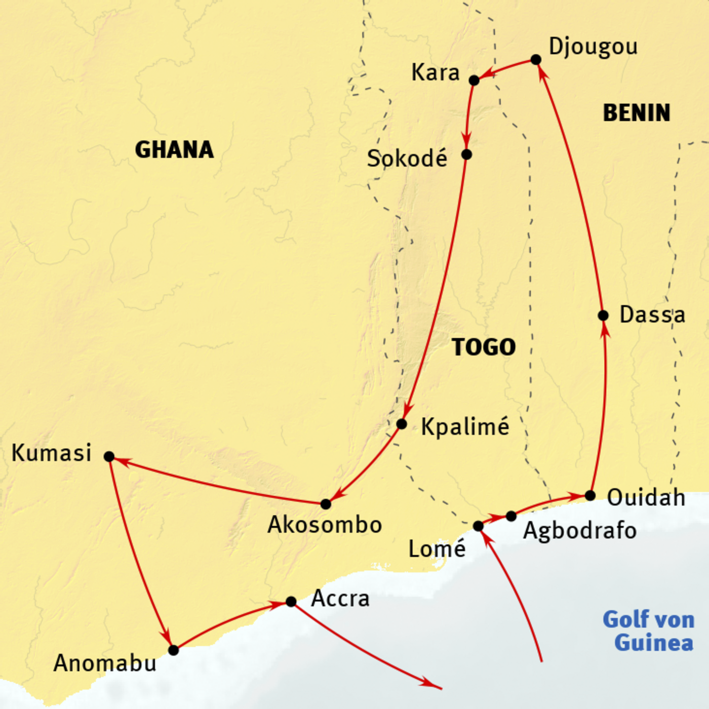 Lomé - Agbodrafo - Ouidah - Ganvié - Abomey - Dassa - Naitingou - Defale - Sokode - Atakpame - Kpalime - Koforidua - Kumasi - Anomabu - Accra