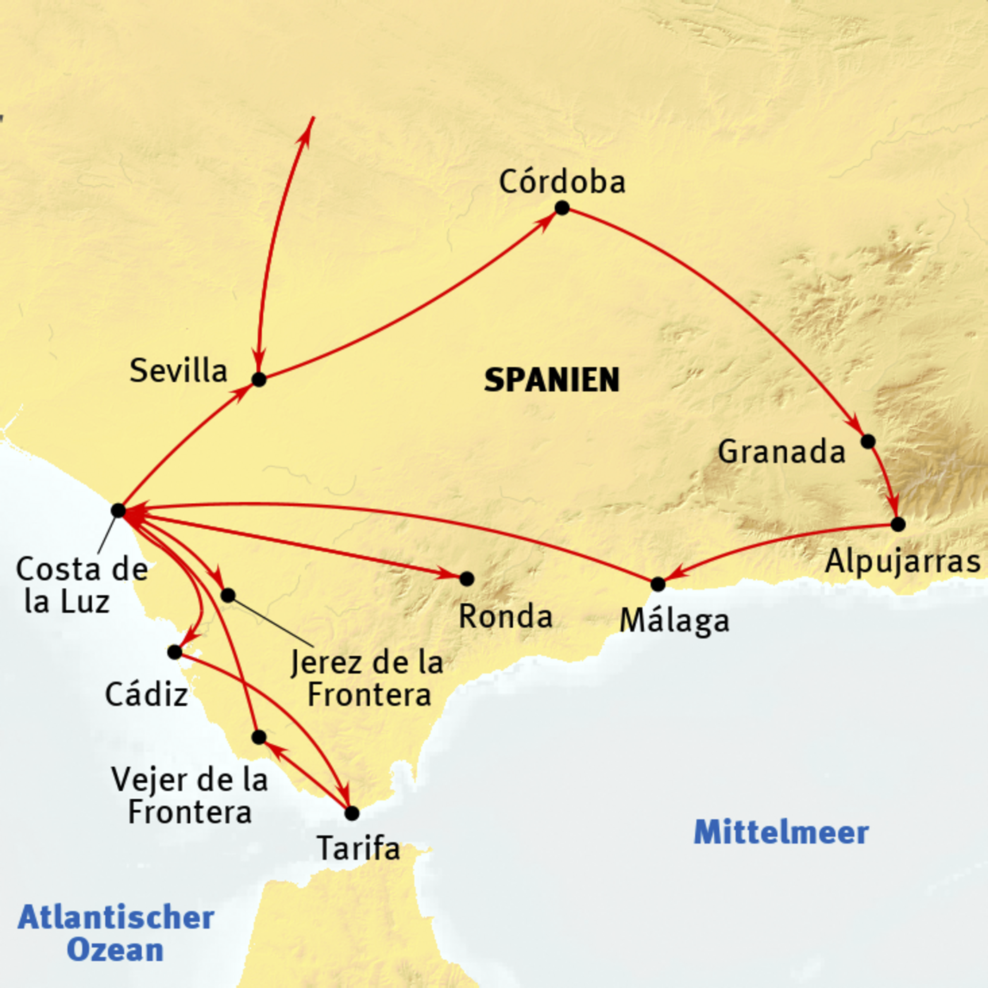 Sevilla - Córdoba - Granada - Alpujarras - Málaga - Costa del la Luz - Ronda - Cádiz - Tarifa - Vejer de la Frontera - Jerez de la Frontera